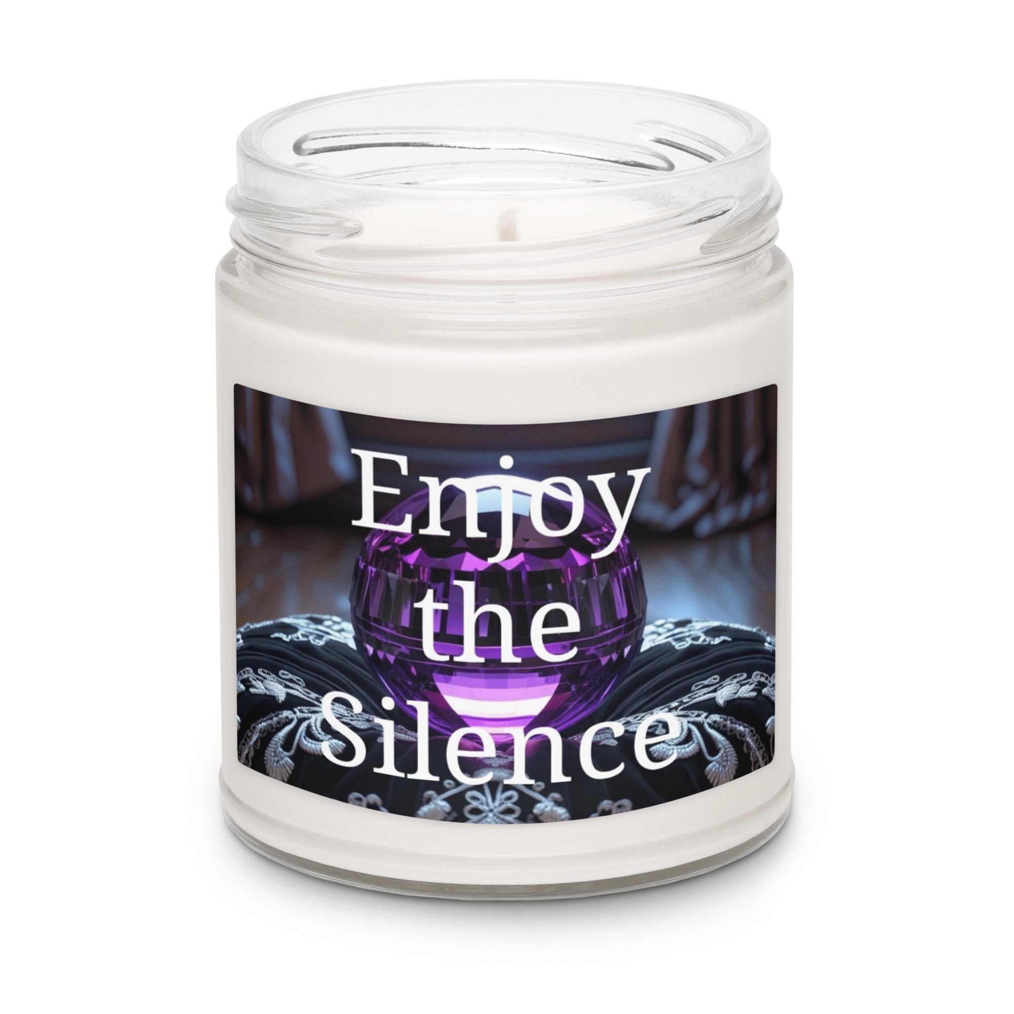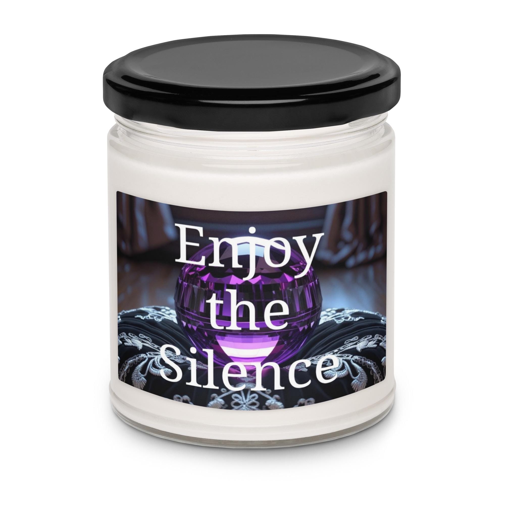 Step into a world of calm and magic with the Enjoy The Silence White Sage & Lavender Scented Soy Candle. Inspired by the iconic Depeche Mode lyrics, this candle features the phrase "Enjoy The Silence" printed on an original graphic art design: a mystical purple crystal ball resting on black velvet, set in a witchy black and purple room.