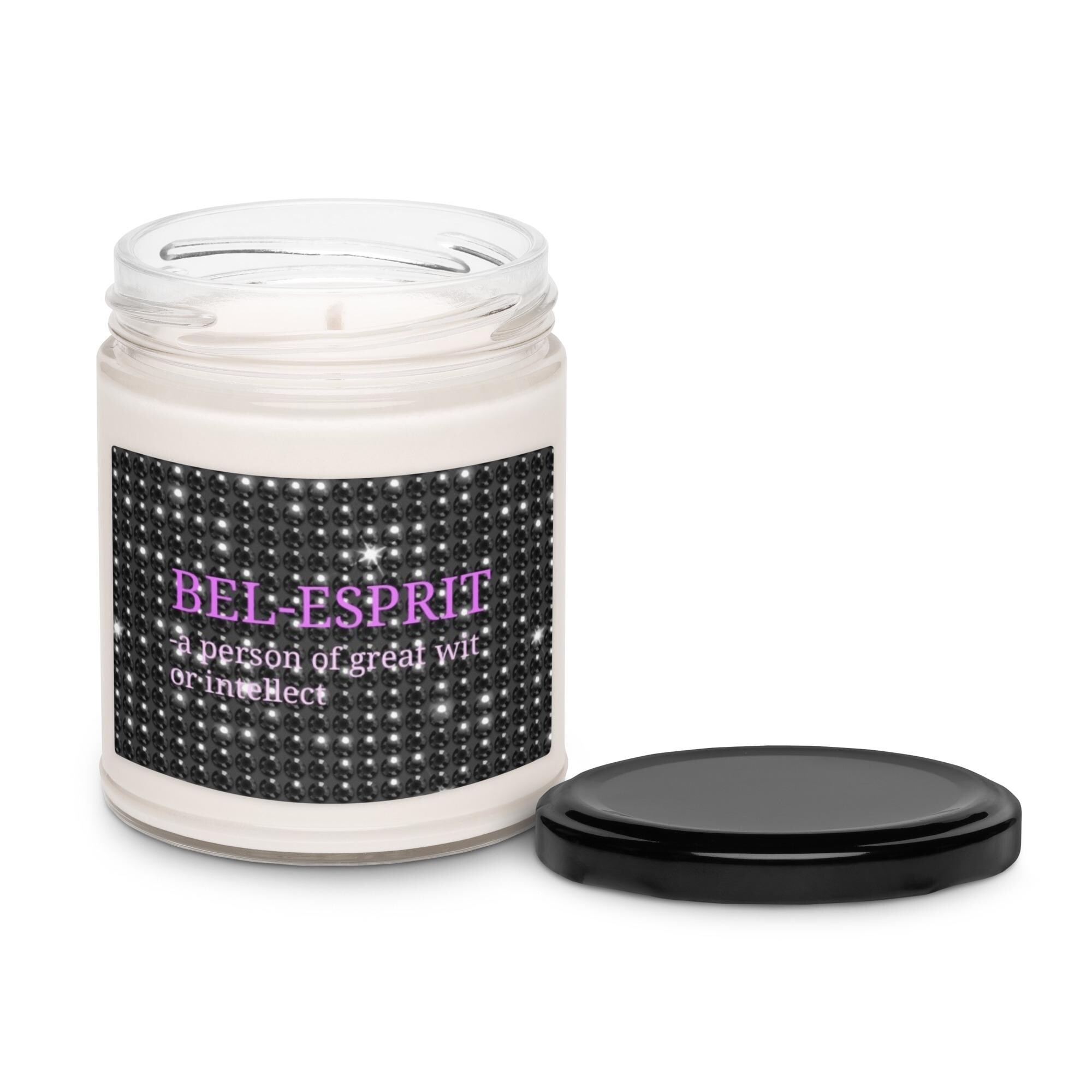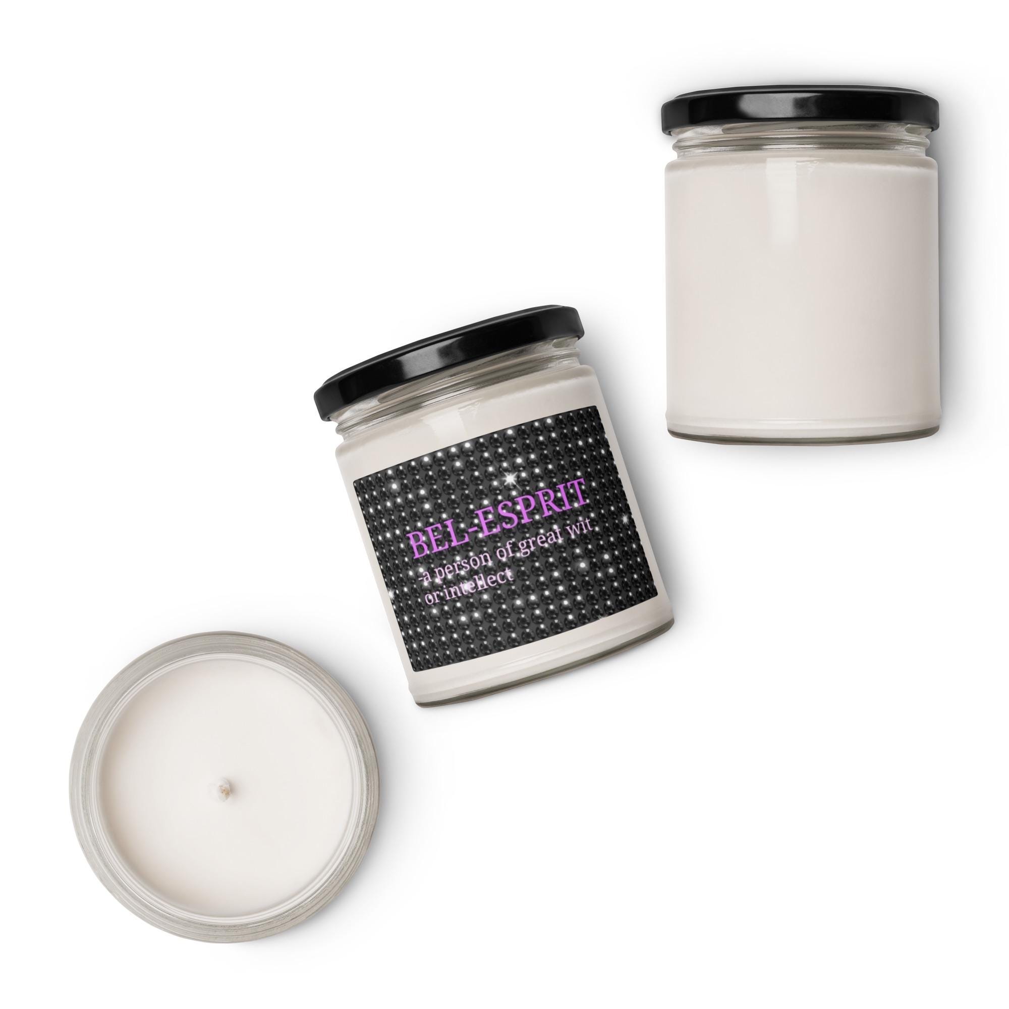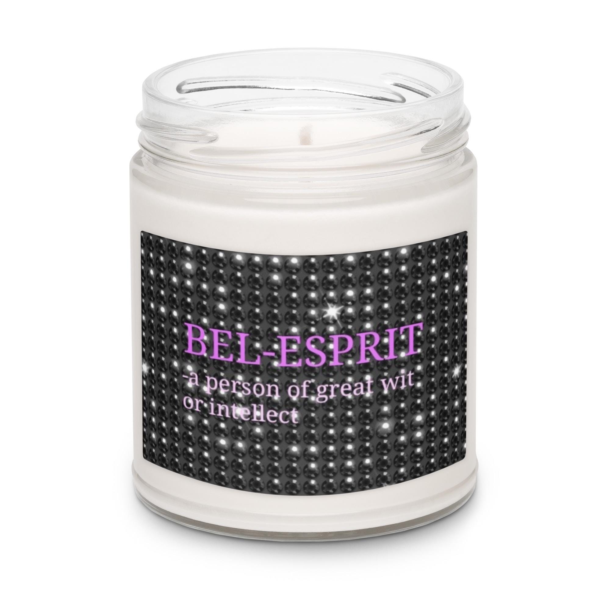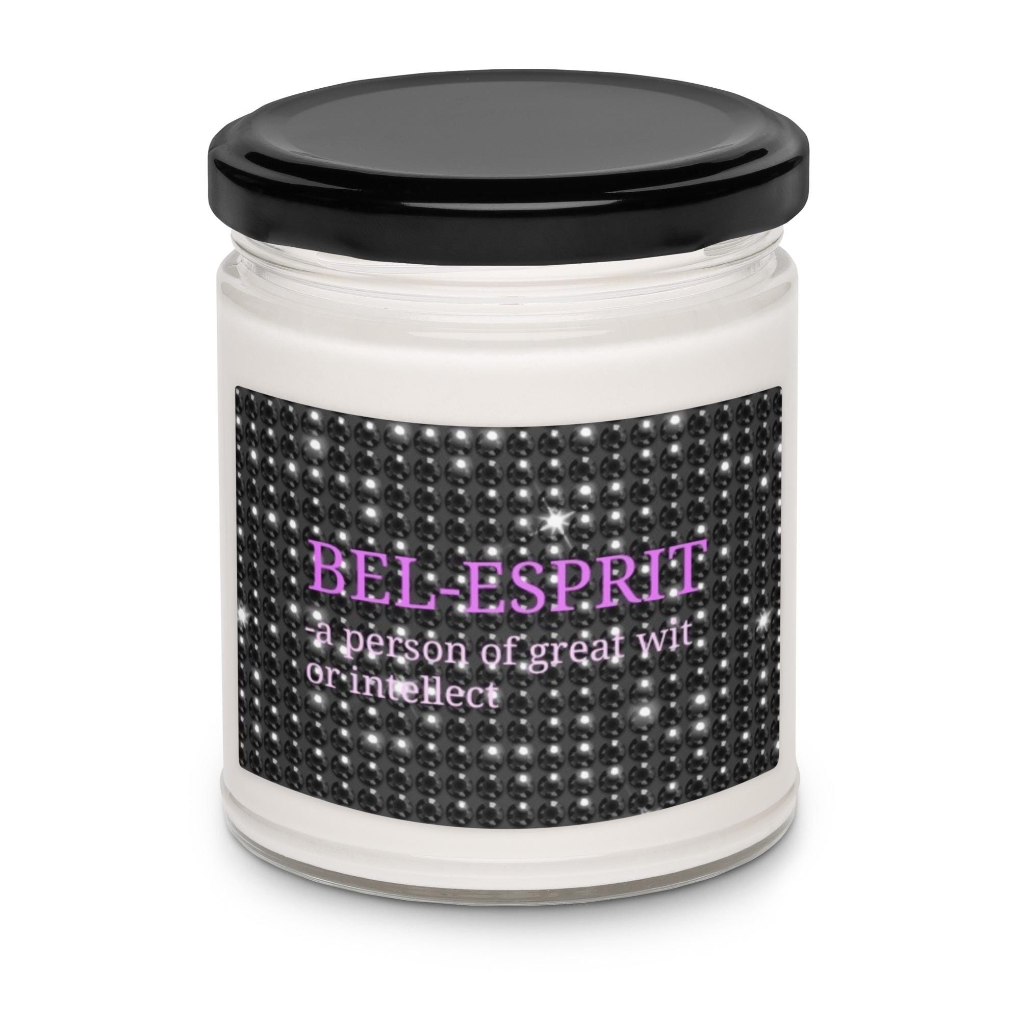 Ignite your inner sparkle with the Bel-Esprit Coconut Cream & Cardamom Scented Soy Candle. Featuring the definition of "Bel-Esprit"—a person of great wit or intellect—printed in bold hot pink font atop an original black and rhinestones background, this candle is designed to inspire self-confidence, positivity, and self-love. The luxurious blend of creamy coconut and spicy cardamom creates an uplifting atmosphere, perfect for free spirits and those who celebrate their fabulousness wit and intellect.