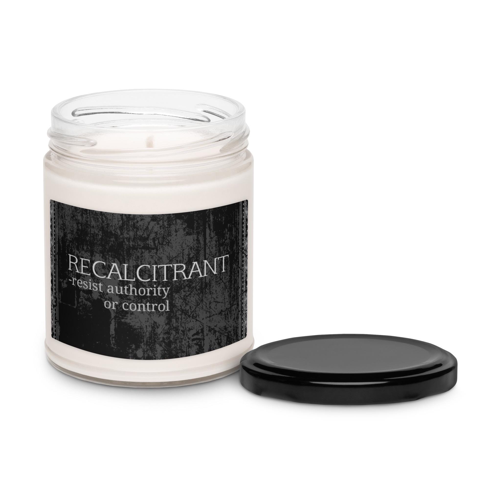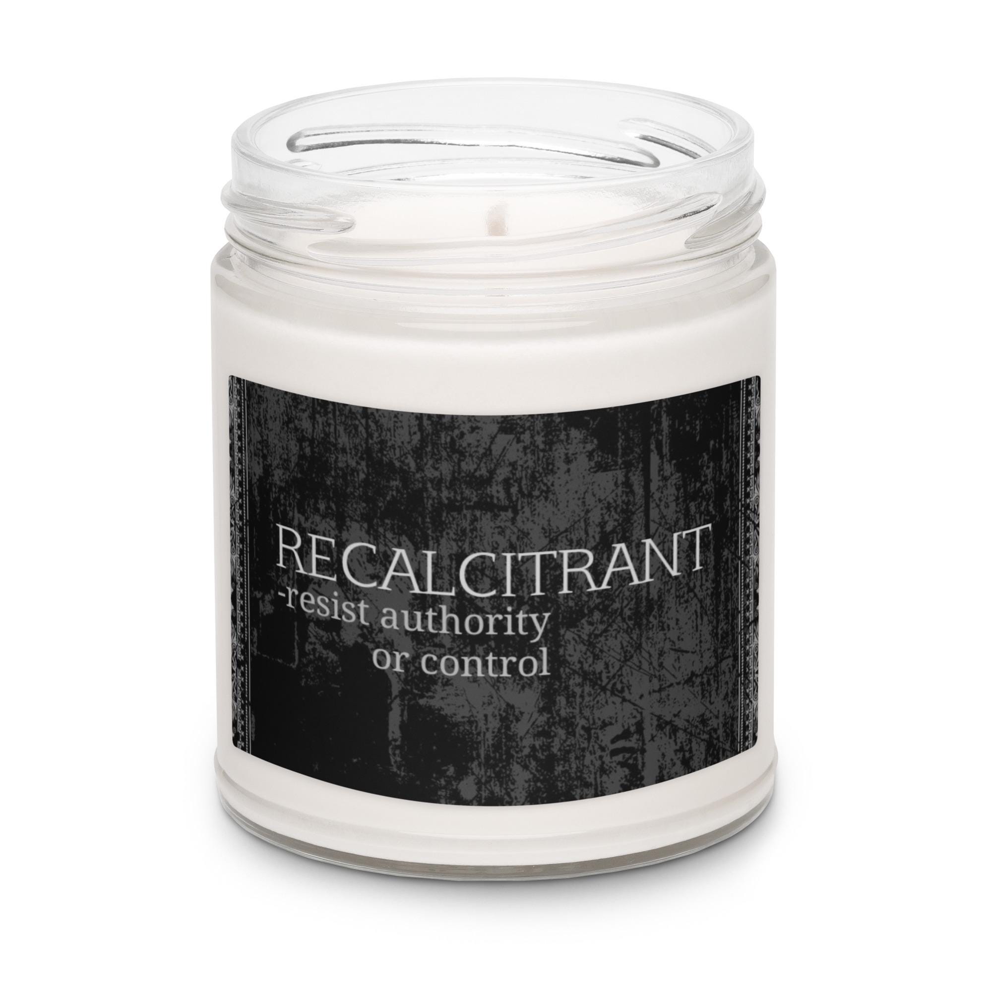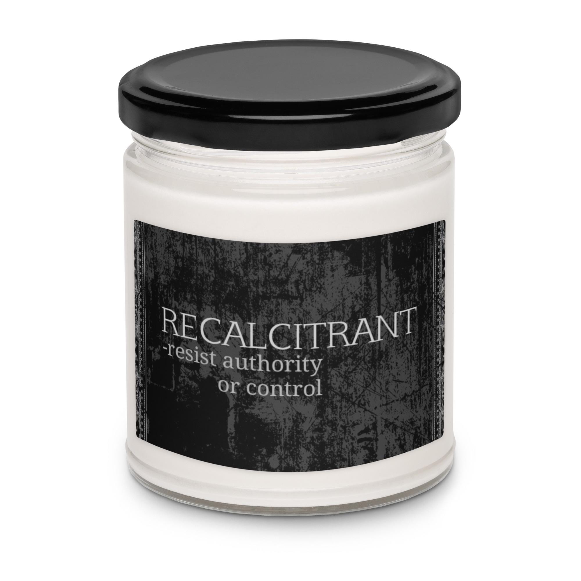 Channel the spirit of rebellion and individuality with the Recalcitrant Peppered Passionfruit Scented Soy Candle. Featuring the definition of "Recalcitrant"—resist authority or control—printed in striking silverish gray font atop an original black velvet background, this candle is crafted to inspire meditation, intention setting, self-confidence, manifestation, and unapologetic non-conformity. The bold, invigorating blend of peppered passionfruit fills any space with a scent as unique and daring as its message.