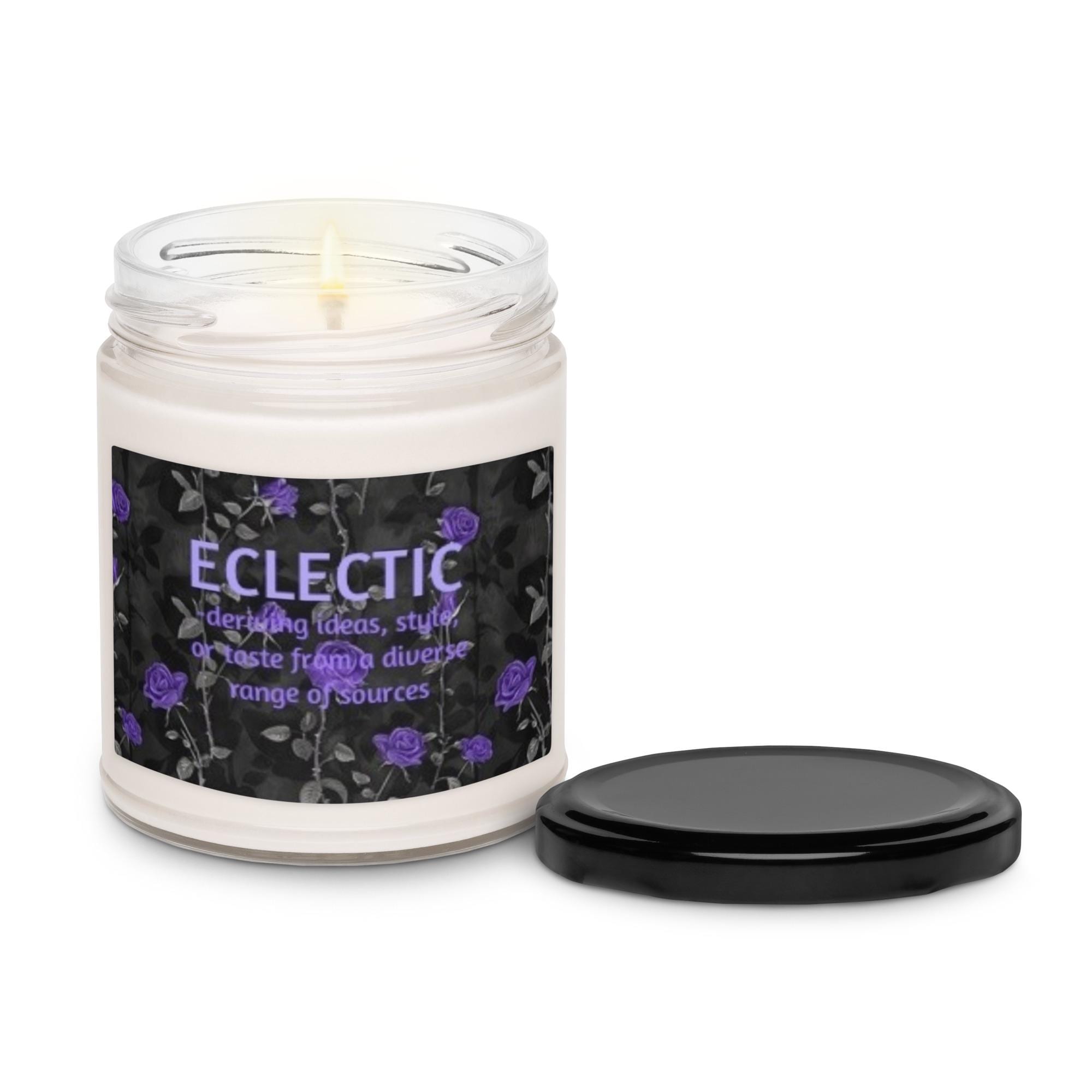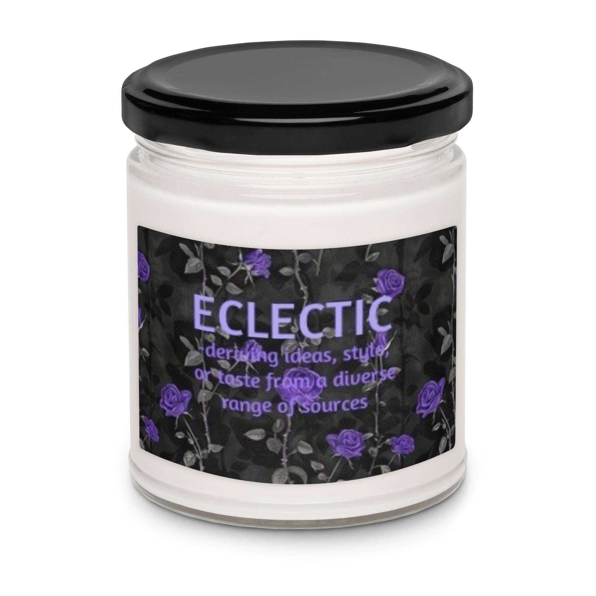 Celebrate creative individuality with the Eclectic Coconut Cream & Cardamom Scented Soy Candle. Showcasing the definition of "Eclectic" in striking purplish blue font, set against an original black background adorned with purplish blue flowers and gray stems, this candle is designed for those who embrace non-conformity, creativity, and unique self-expression. The creamy coconut and warm cardamom scent blend together to create an inviting, inspiring atmosphere—perfect for the eclectic woman or witch with a flair for the arts and a love for the unconventional.