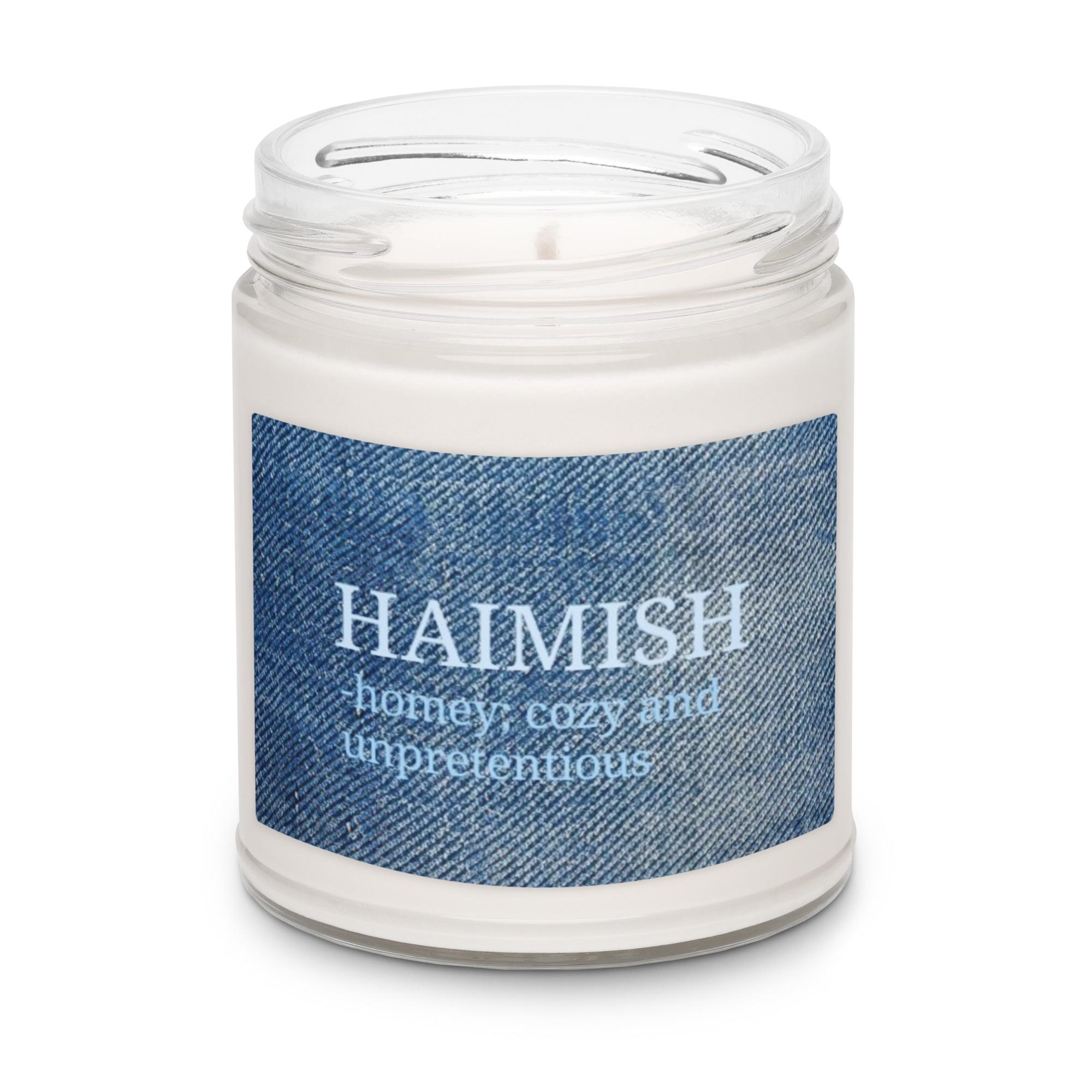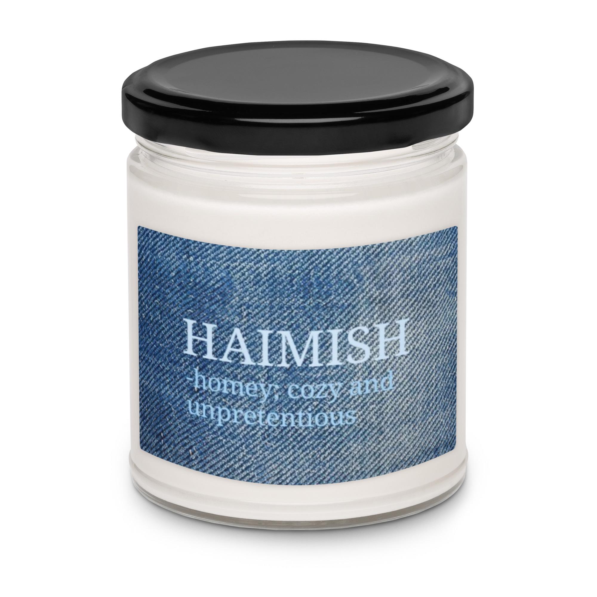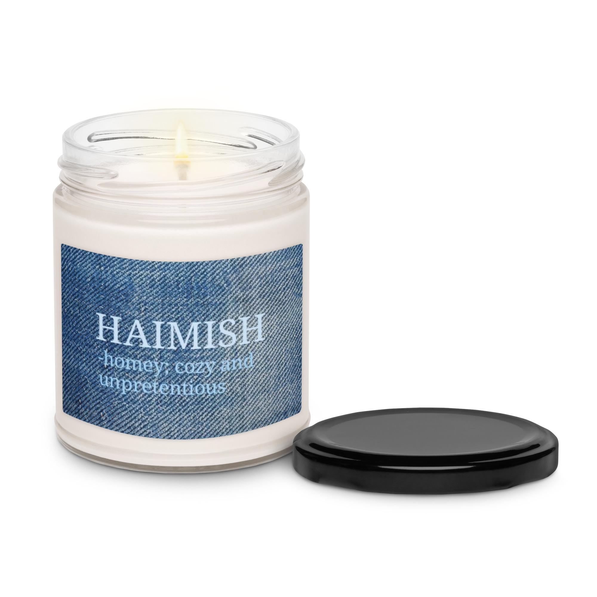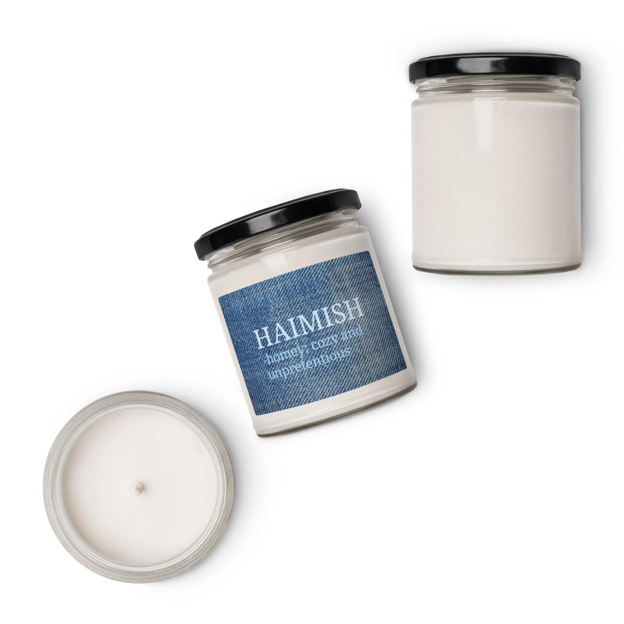 Create a cozy, welcoming sanctuary with the Haimish Sea Salt & Orchid Scented Soy Candle. This candle features the definition of "haimish" in soothing light blue font, printed on a denim fabric design background, blending the comforting meaning of the word with a fresh, tranquil scent. The gentle notes of sea salt and delicate orchid fill any space with calm and relaxation, making it the perfect companion for introverts, homebodies, and anyone seeking peace.