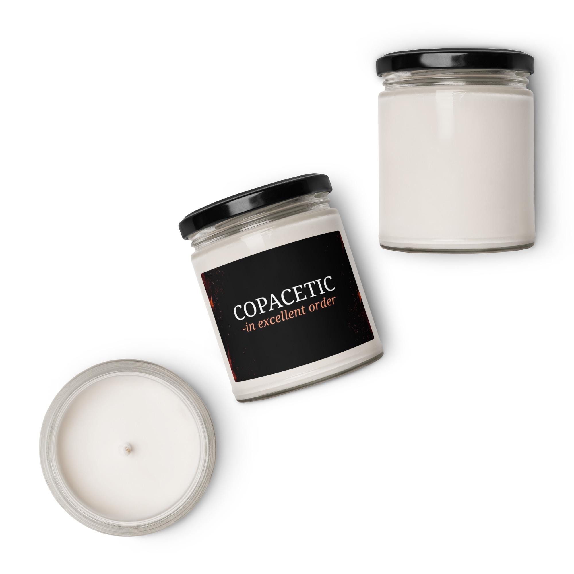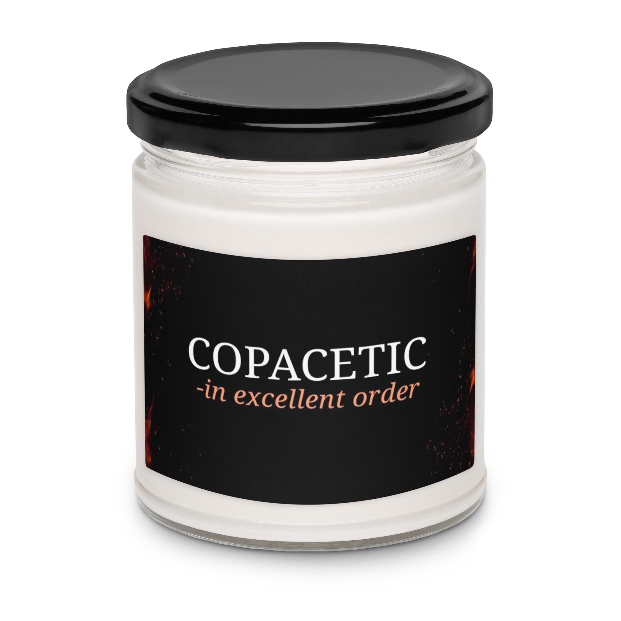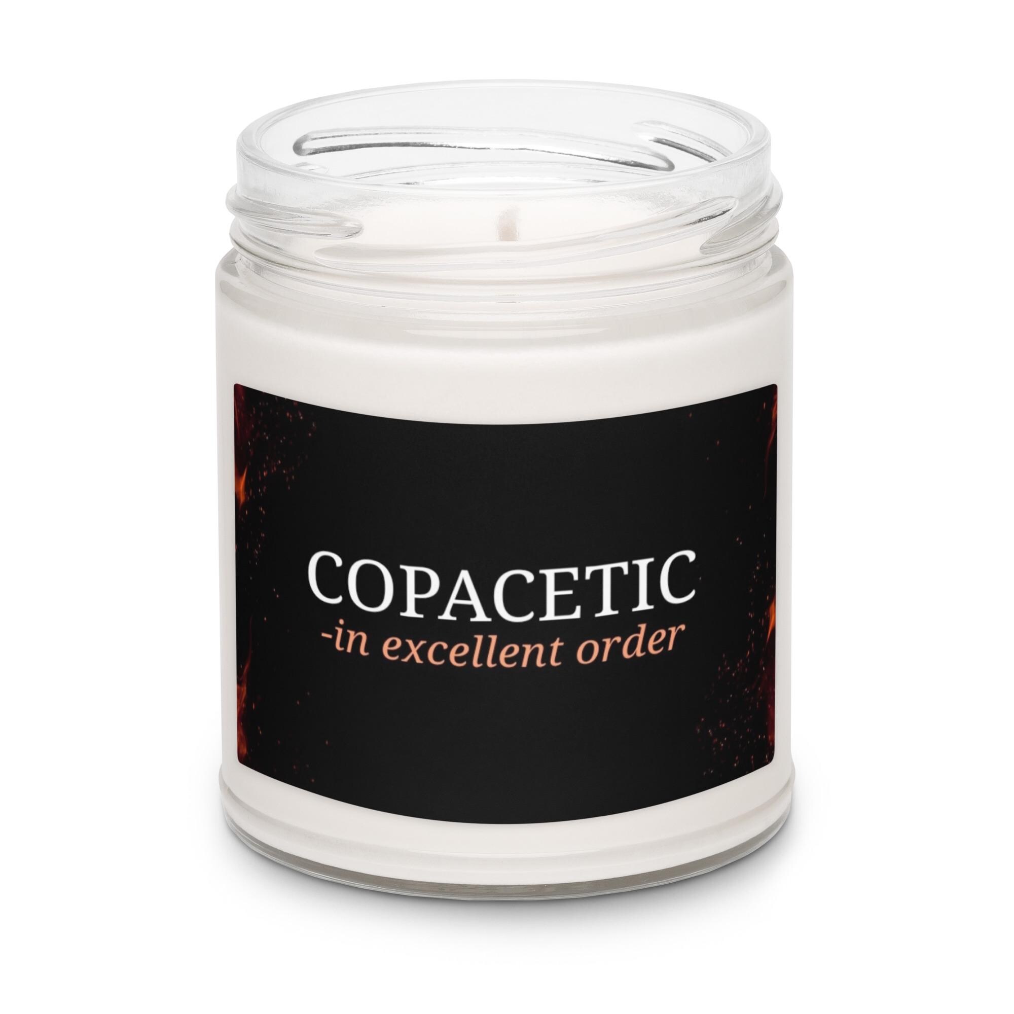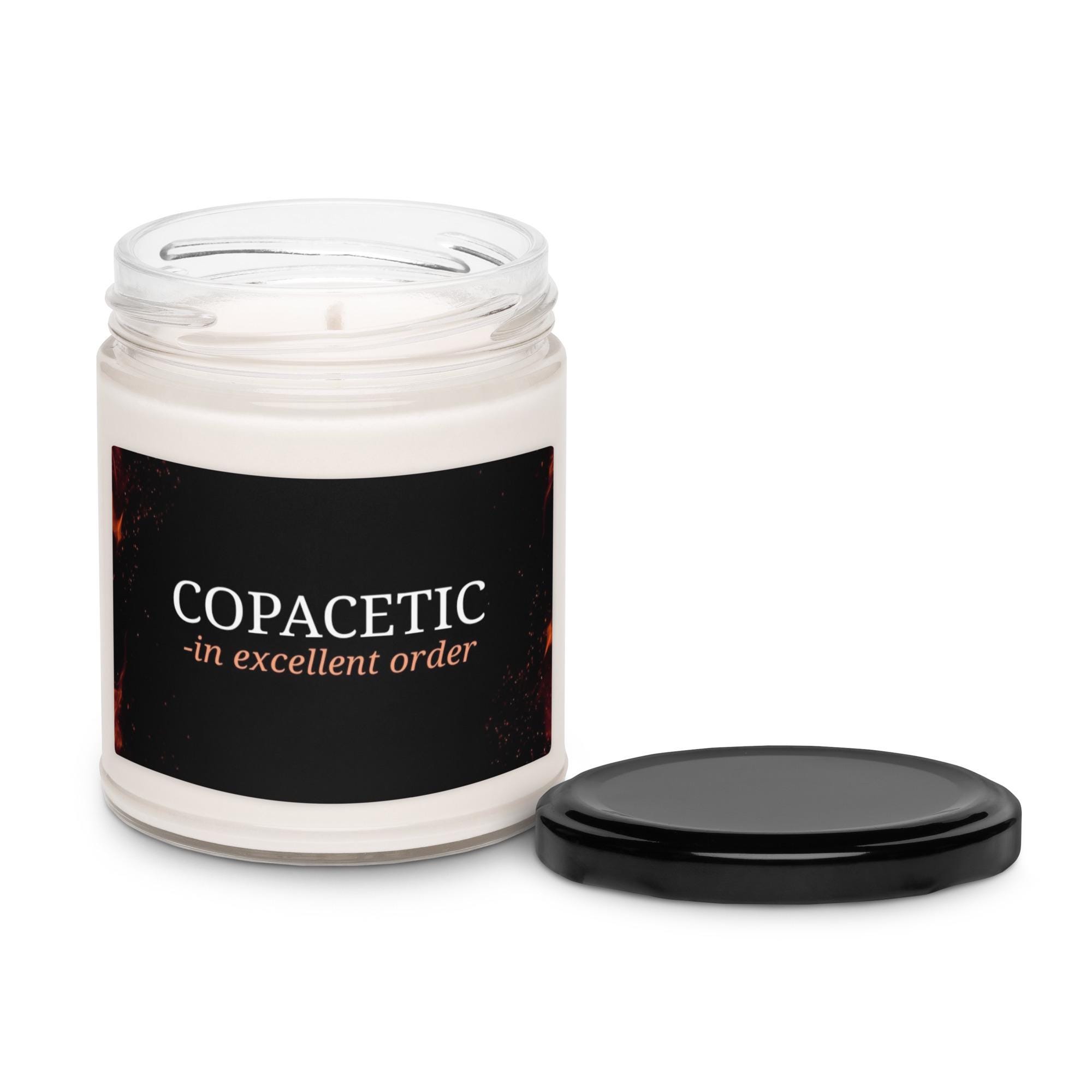 Design: Black background with subtle flame accents and "Copacetic" definition in white and light orange font