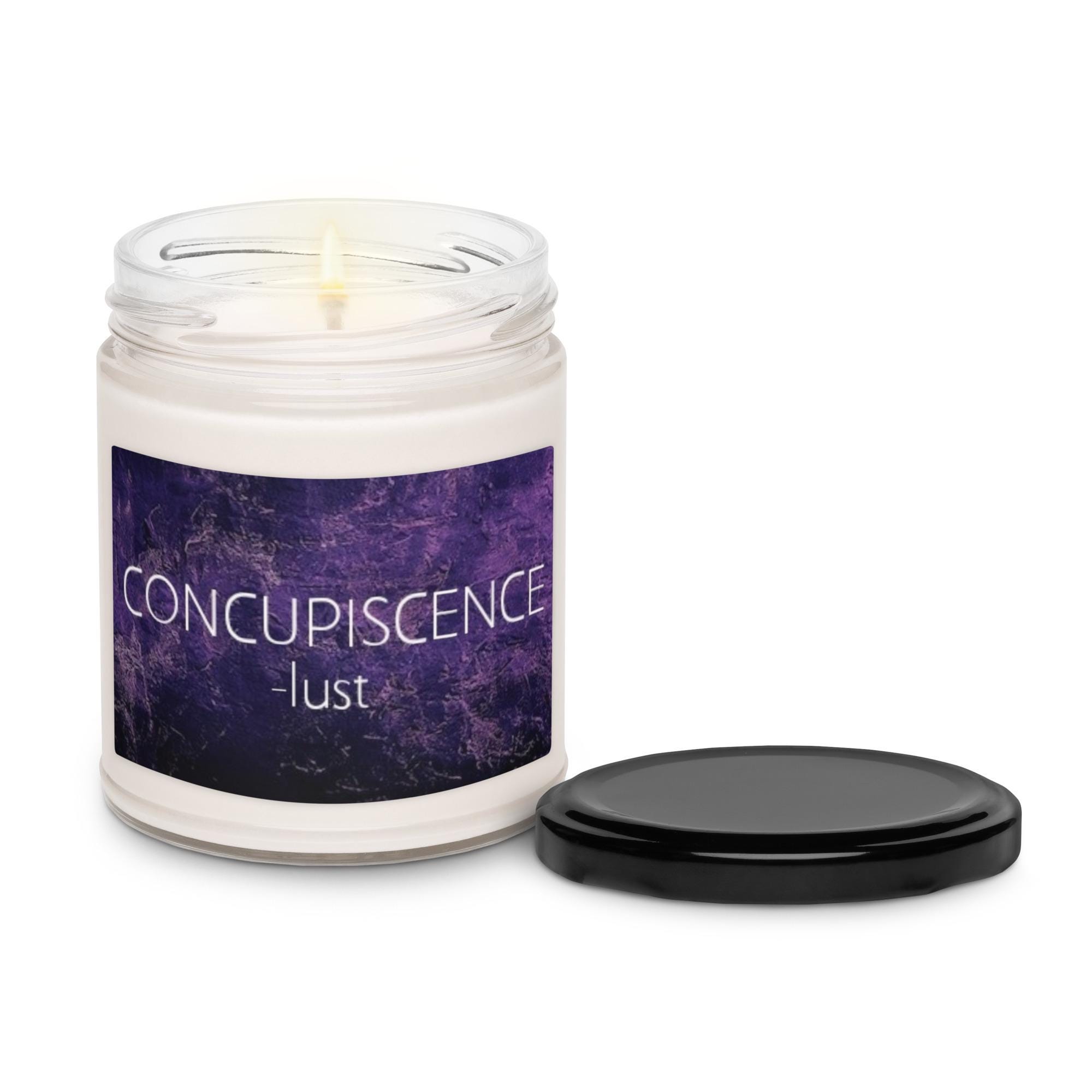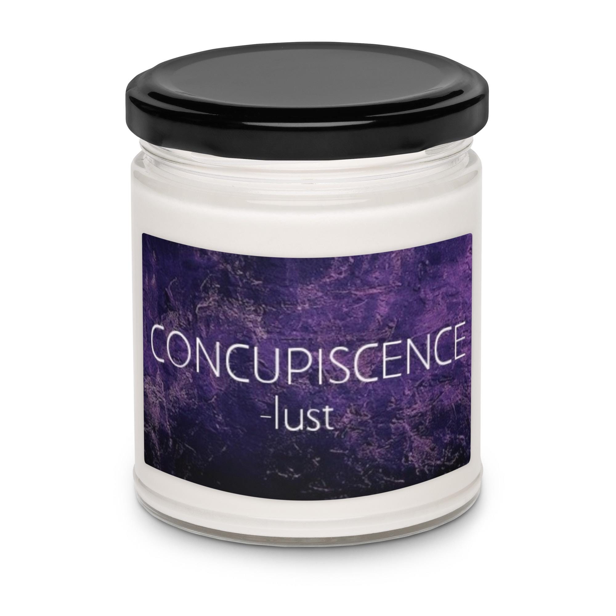 Design: Purple velvet-inspired background with "Concupiscence" definition in white font