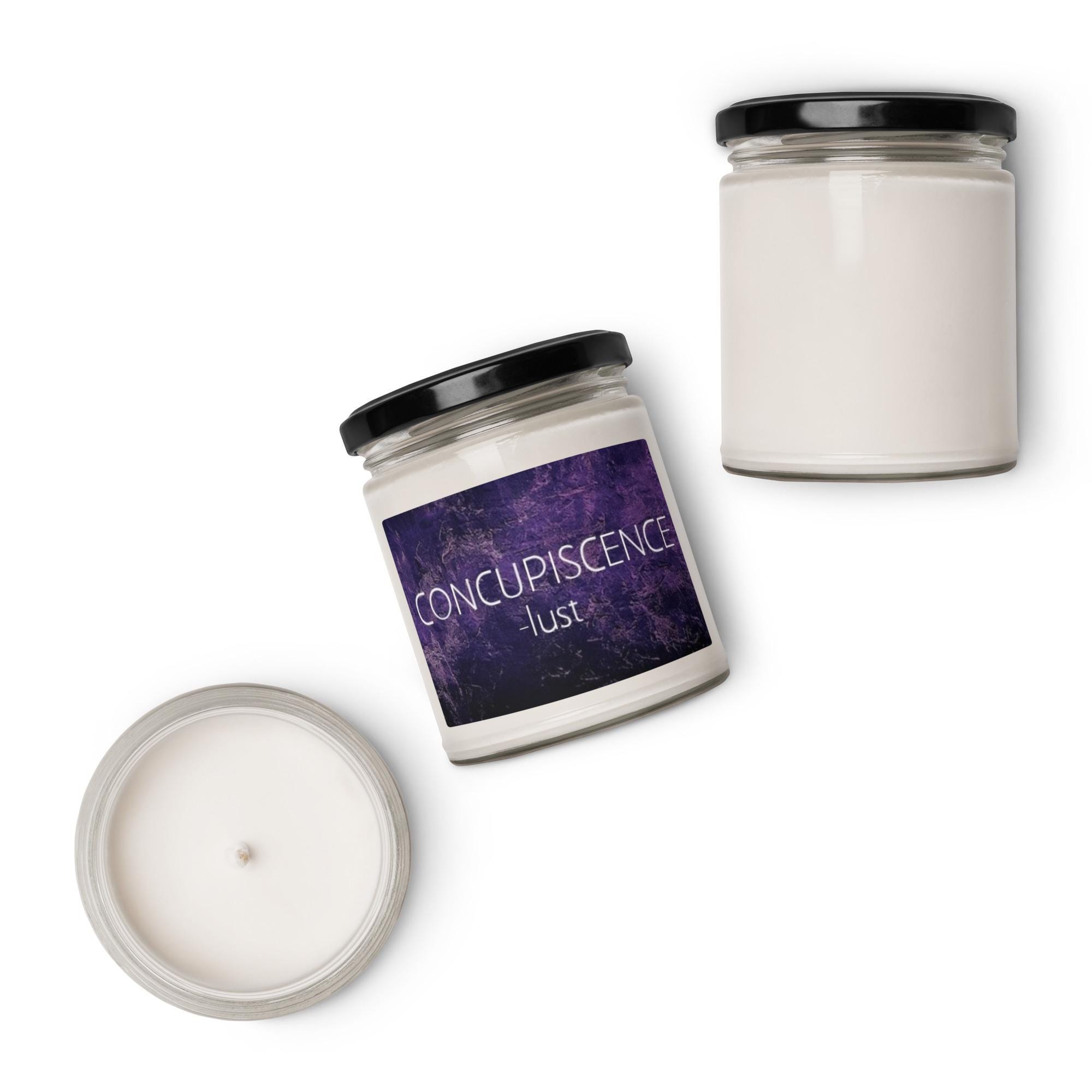 Ignite desire and passion with the Concupiscence Peppered Passionfruit Scented Soy Candle. This candle features the definition of "Concupiscence" in a sultry white font, elegantly printed on a plush purple velvet-like background. The bold, juicy notes of passionfruit entwined with a hint of pepper create a scent that is as alluring and intoxicating as the word itself, blending fragrance and meaning for a truly unique sensory experience.