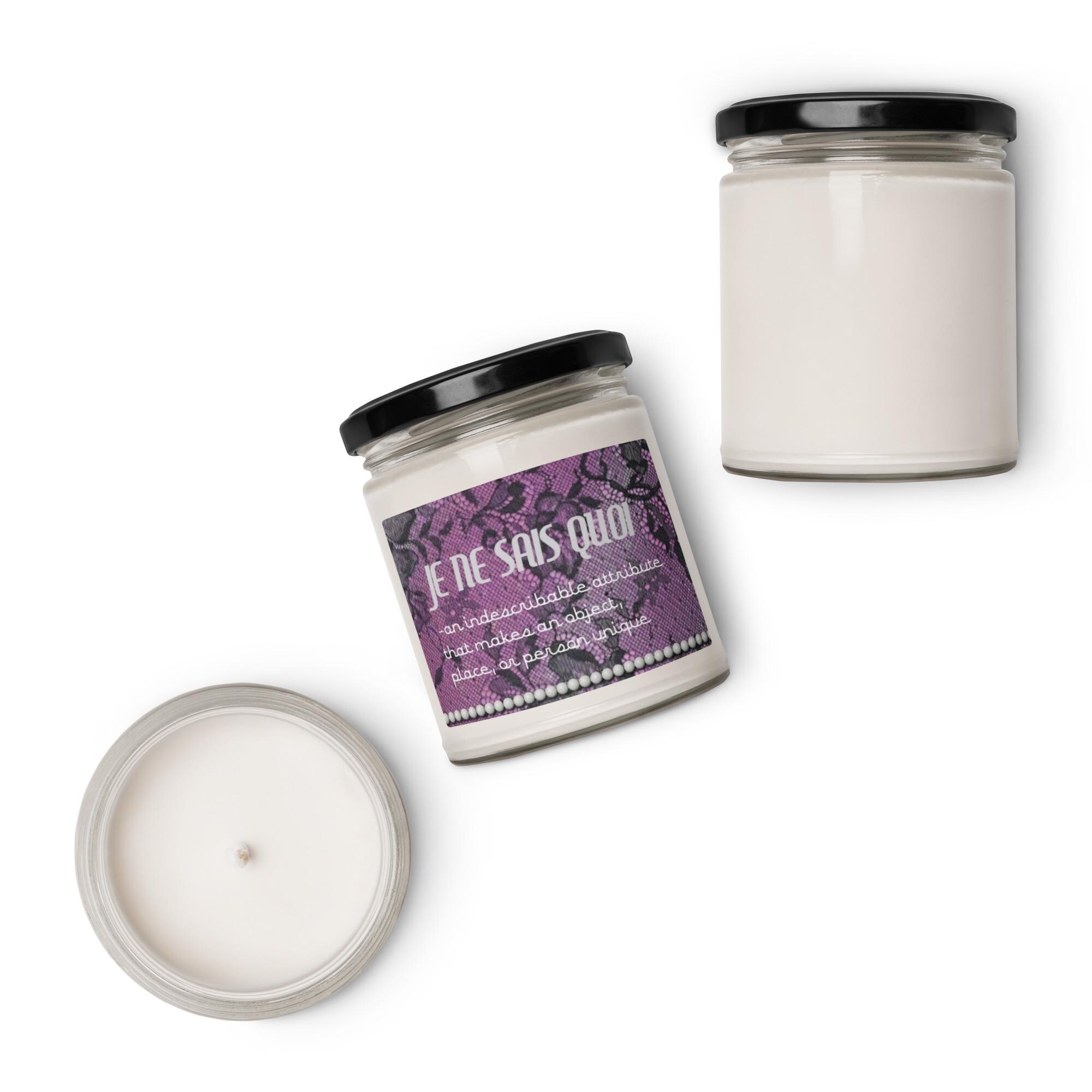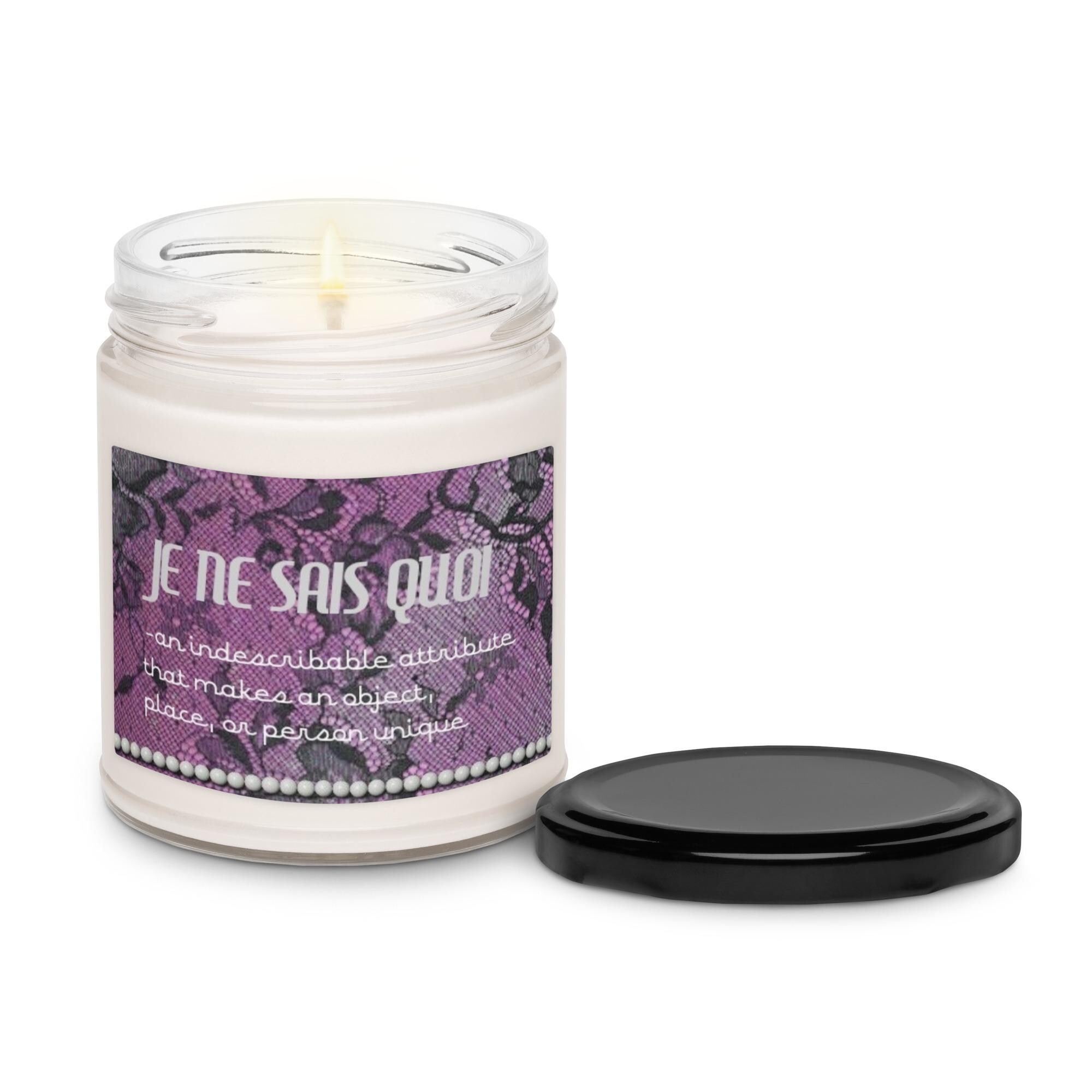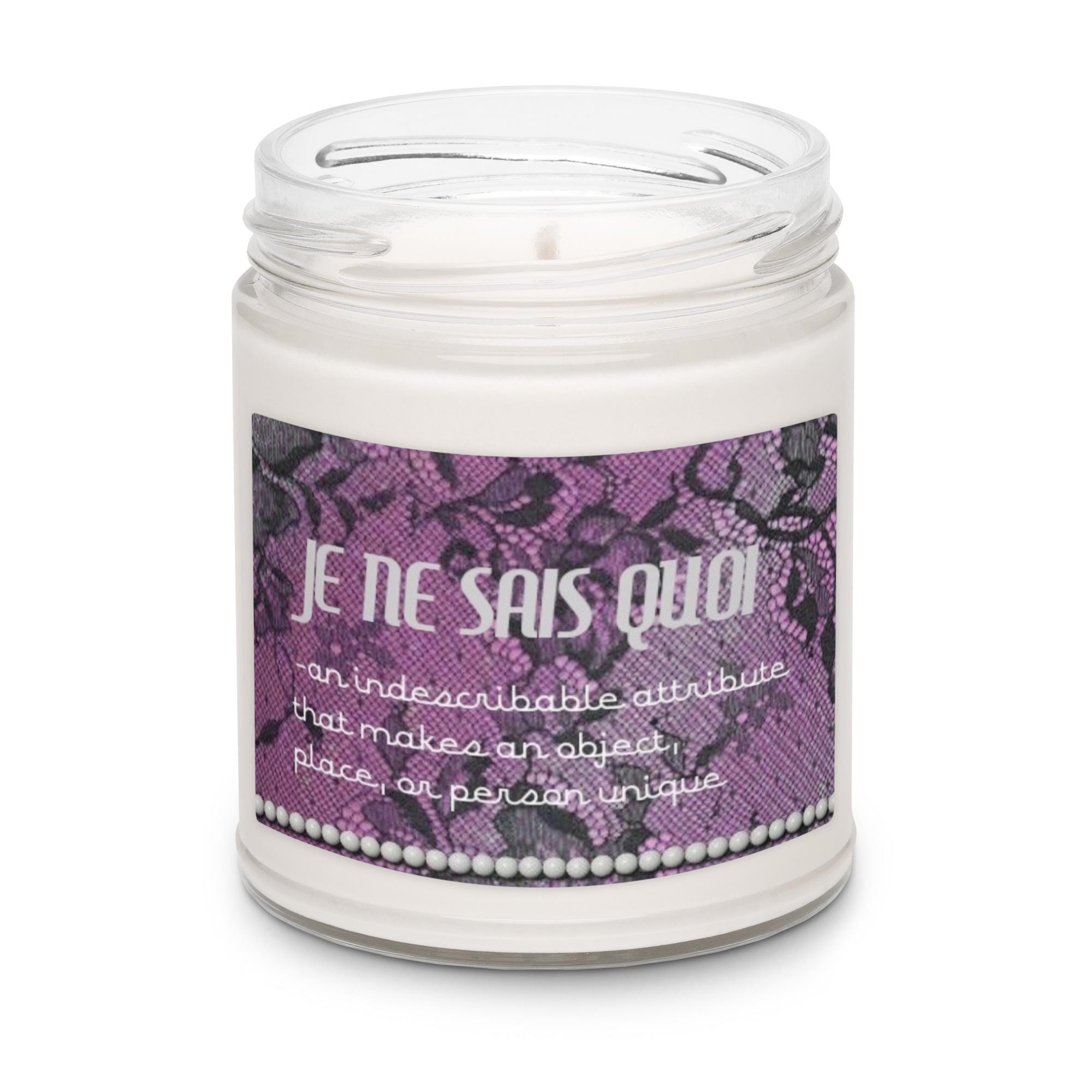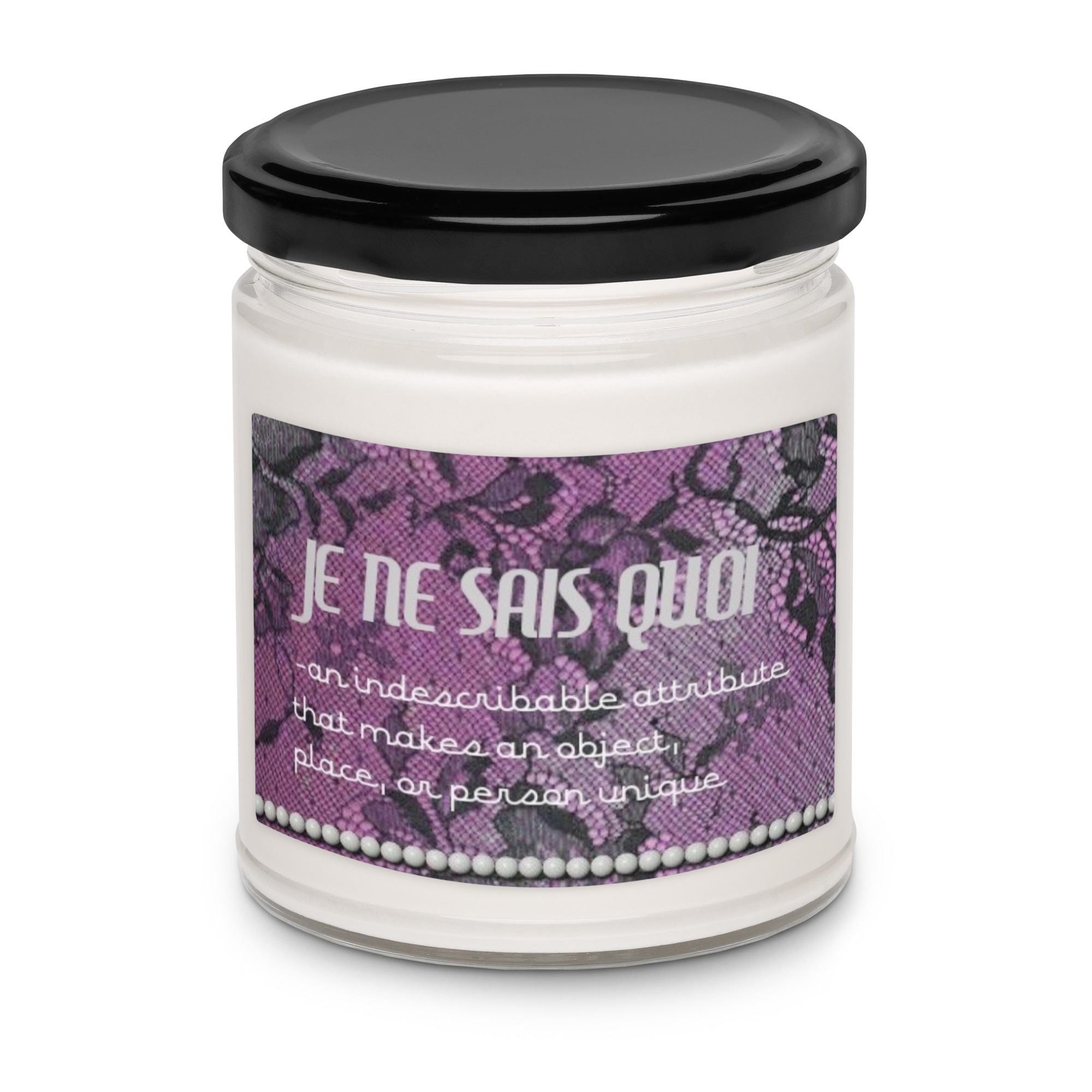 Celebrate individuality and irresistible charm with the Je Ne Sais Quoi Sea Salt & Orchid Scented Soy Candle. This candle features the definition of "Je Ne Sais Quoi" in a delicate light purple font, elegantly displayed on a background of purple mesh lace adorned with black flowers and a string of pearls along the bottom edge. The fresh, airy notes of sea salt blend seamlessly with the soft floral essence of orchid, creating a scent as unique and enchanting as the phrase itself.