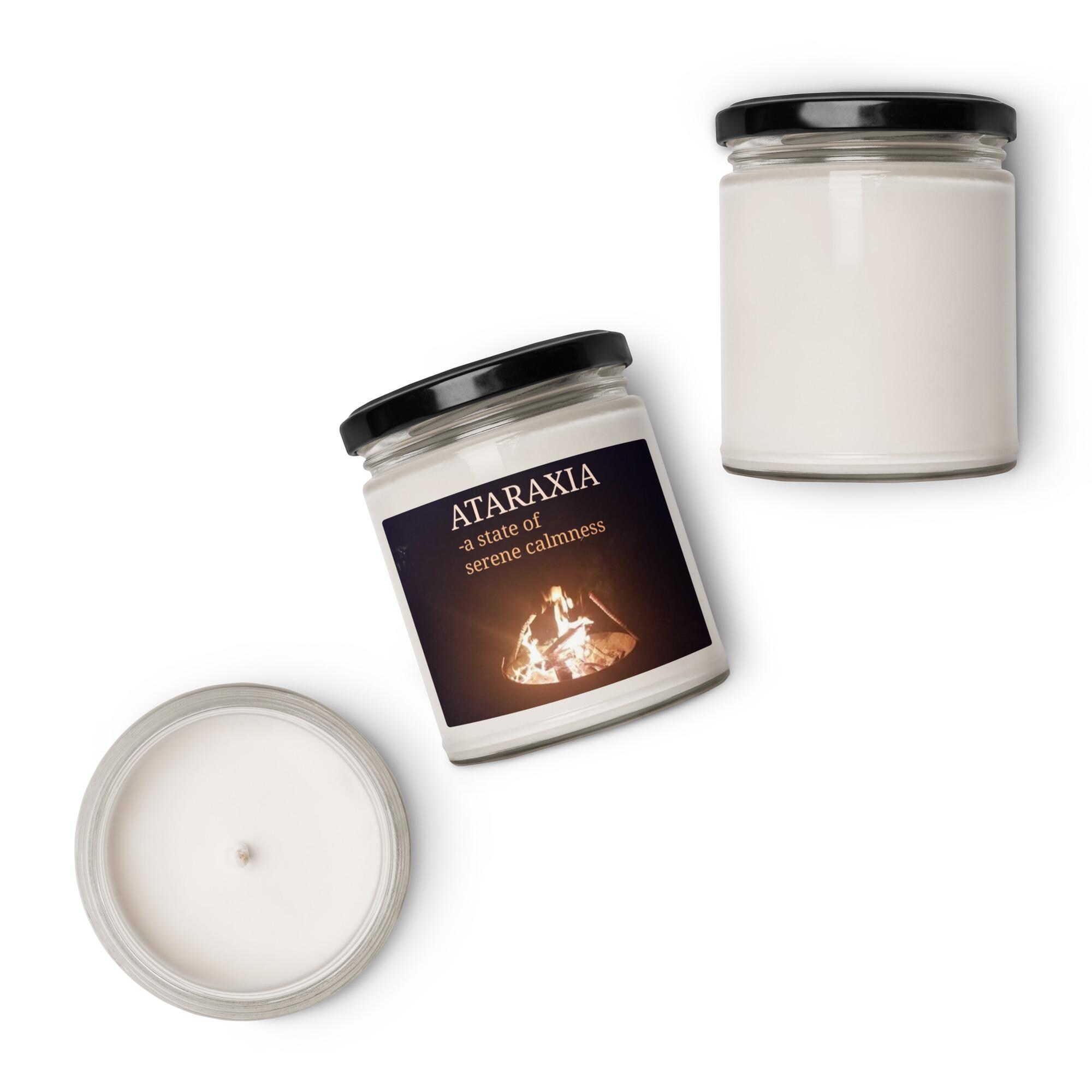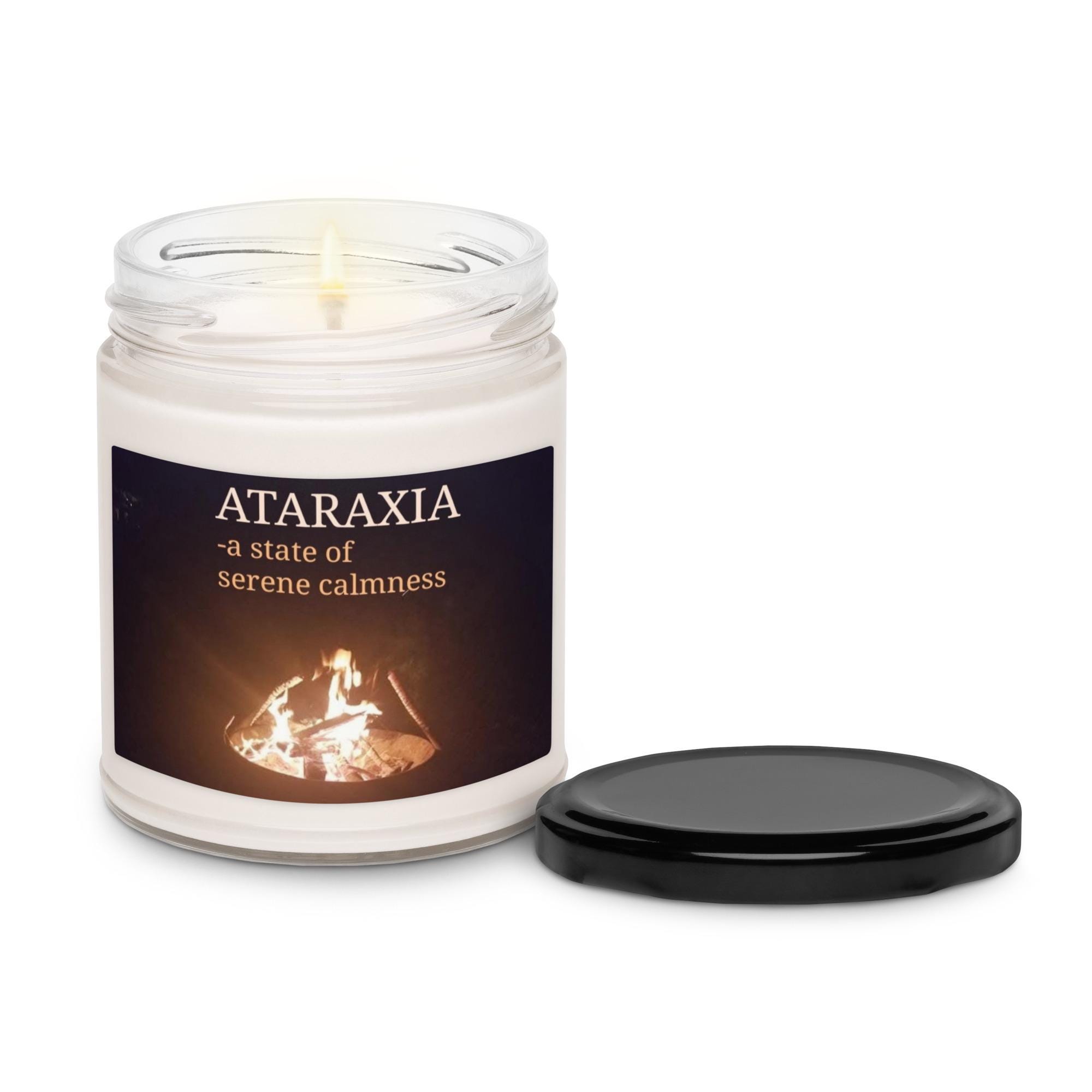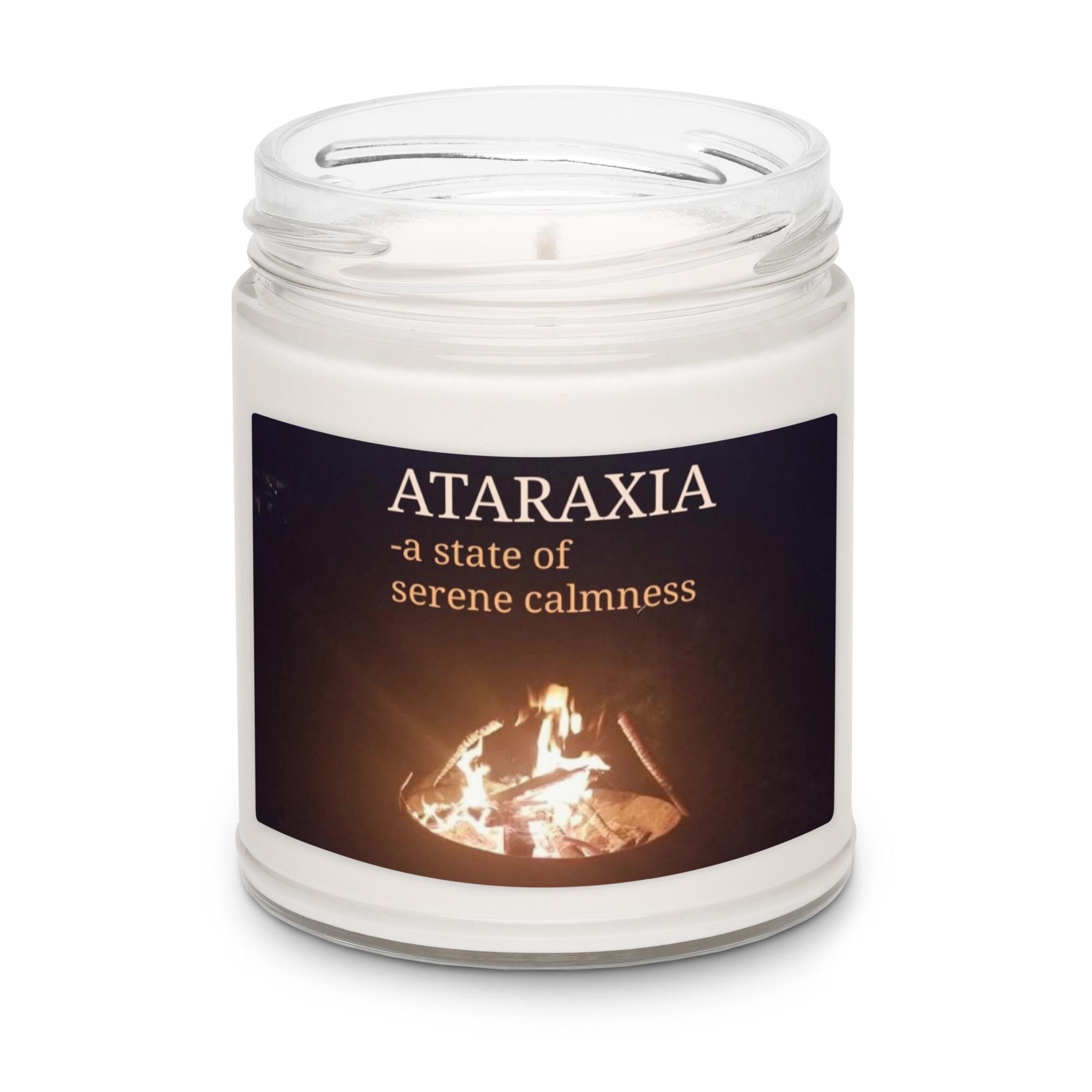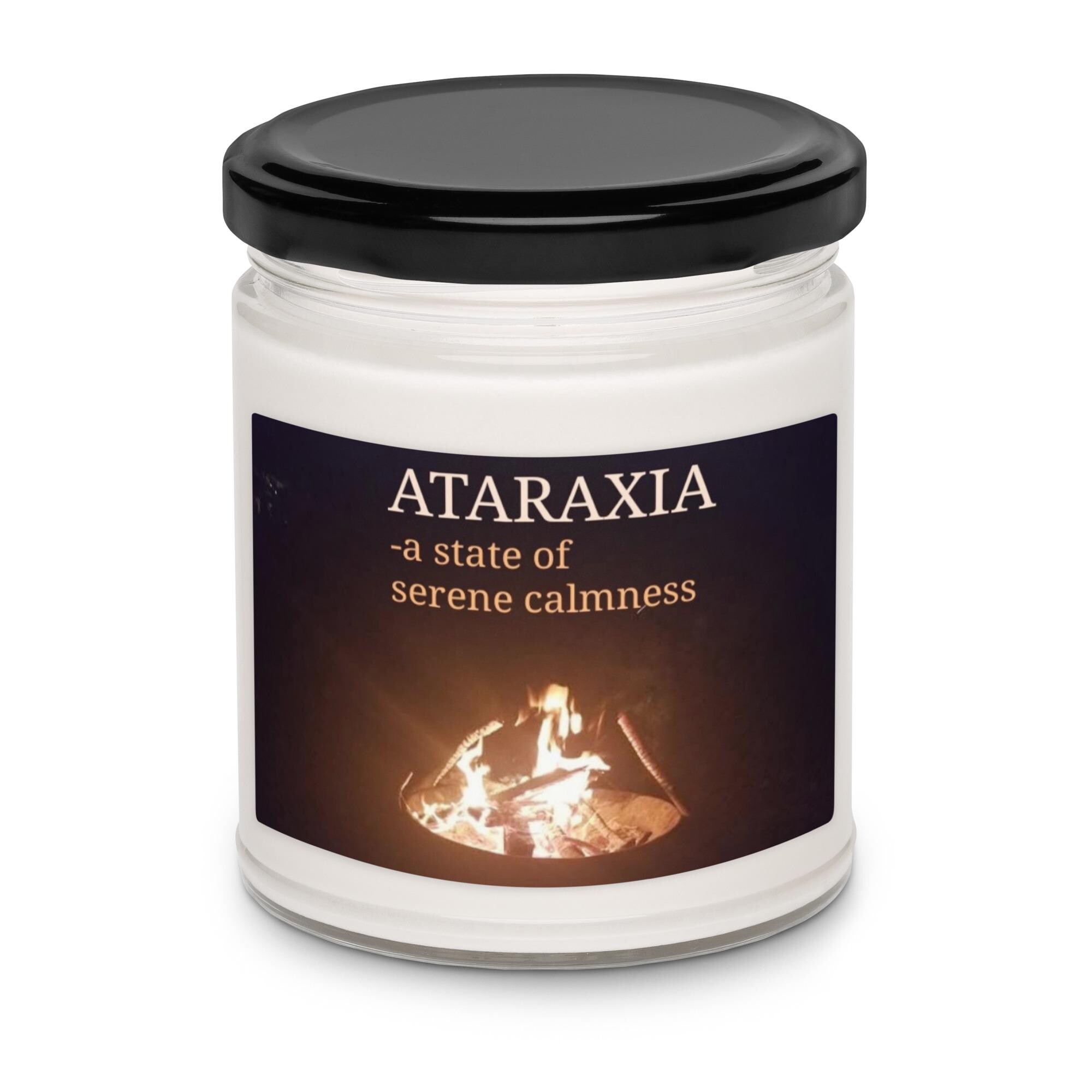 Ignite tranquility and fiery spirit with the Ataraxia Cinnamon Vanilla Scented Soy Candle. This unique candle features the definition of "Ataraxia" in shades of light orange font, printed over an original Karma Craftess photograph of fire dancing in a backyard fire pit. The warm, spicy blend of cinnamon and creamy vanilla is crafted to evoke both the calm and the energy of a glowing fire, blending scent and meaning for a one-of-a-kind vibe.
