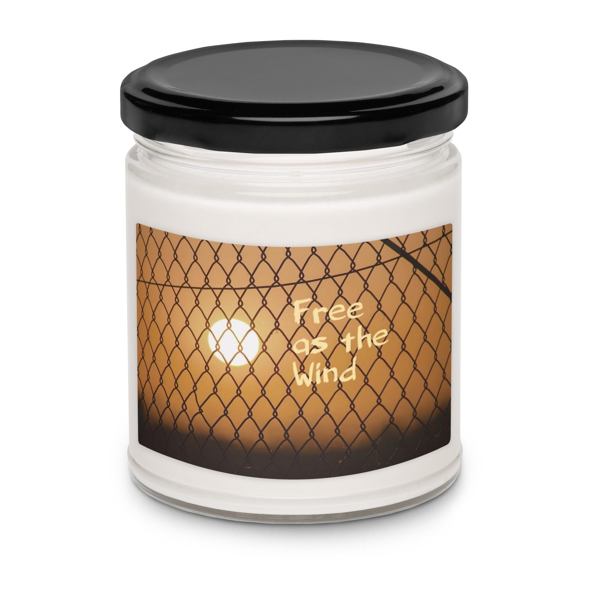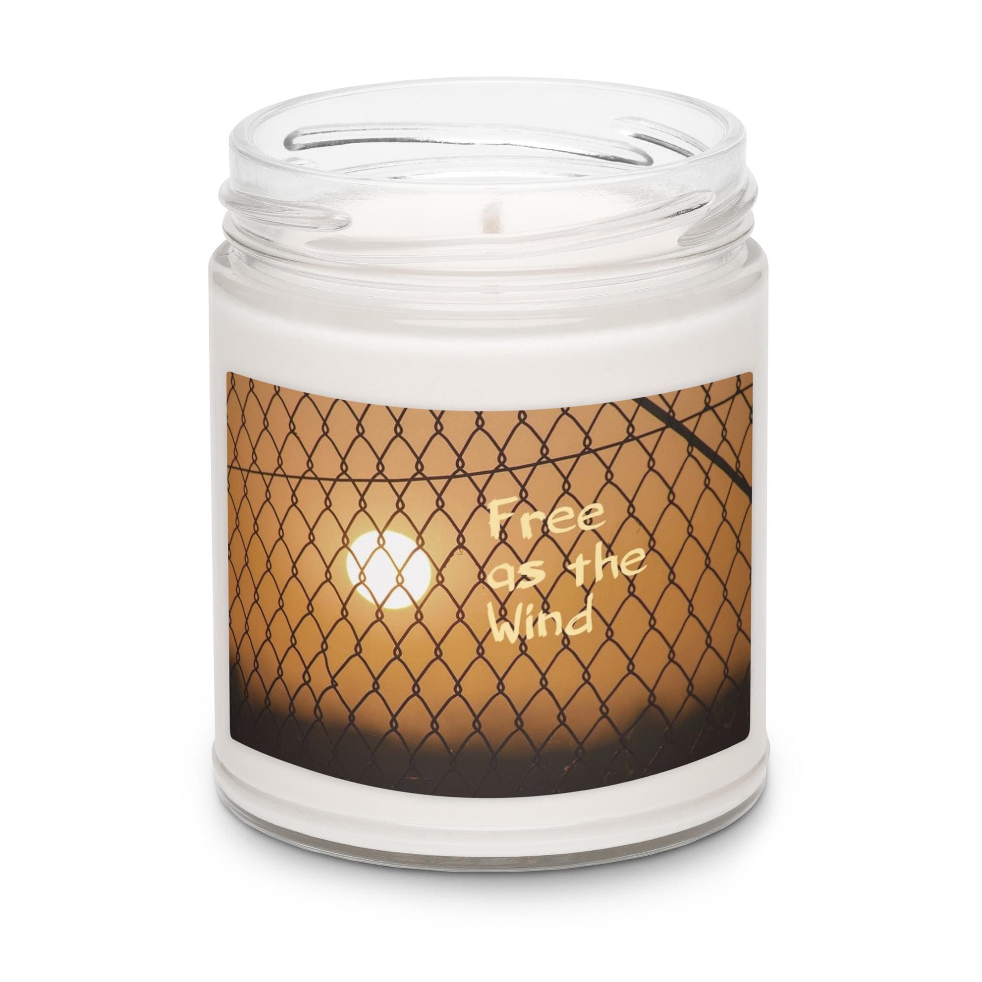 Bask in the glow of freedom and warmth with the Free As The Wind Cinnamon Vanilla Scented Soy Candle. Featuring the inspiring quote in soft light orange font, this candle is set against a chain link fence design with a radiant full sun in an orange sky at golden hour. The comforting blend of spicy cinnamon and creamy vanilla creates a cozy yet liberating aroma, perfectly paired with the free-spirited message and glowing sunset design.