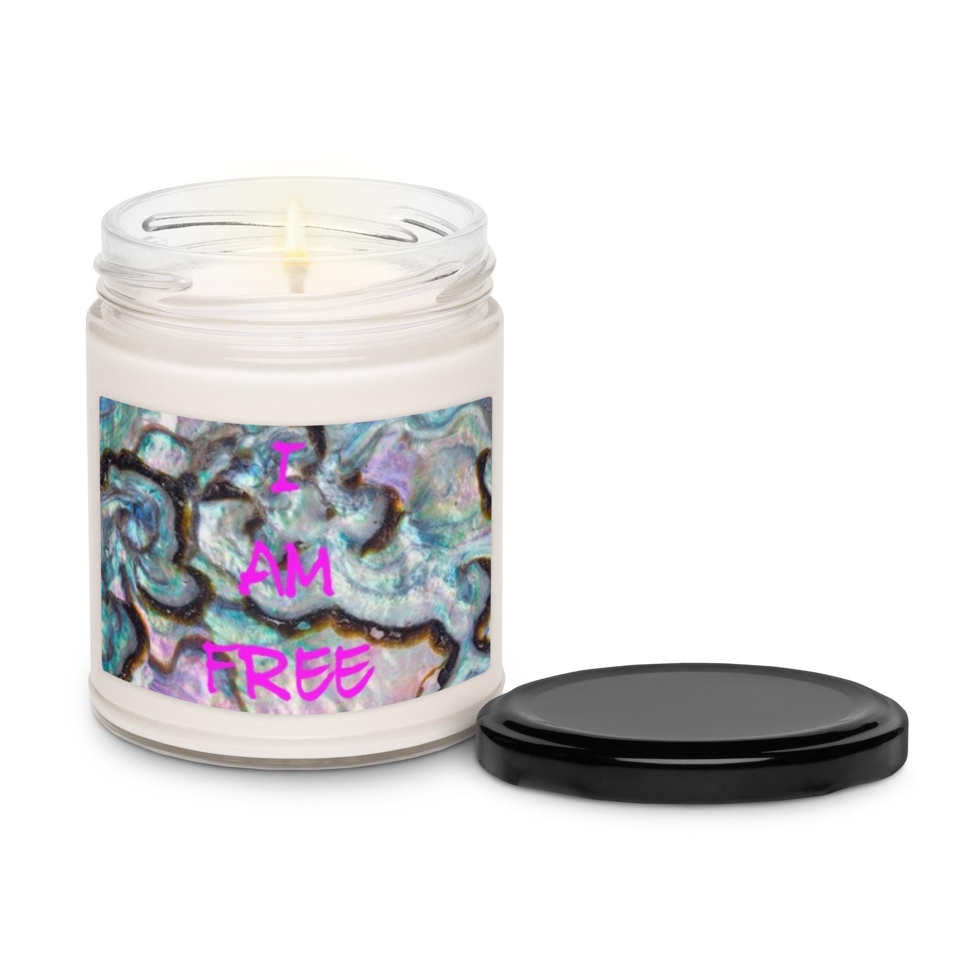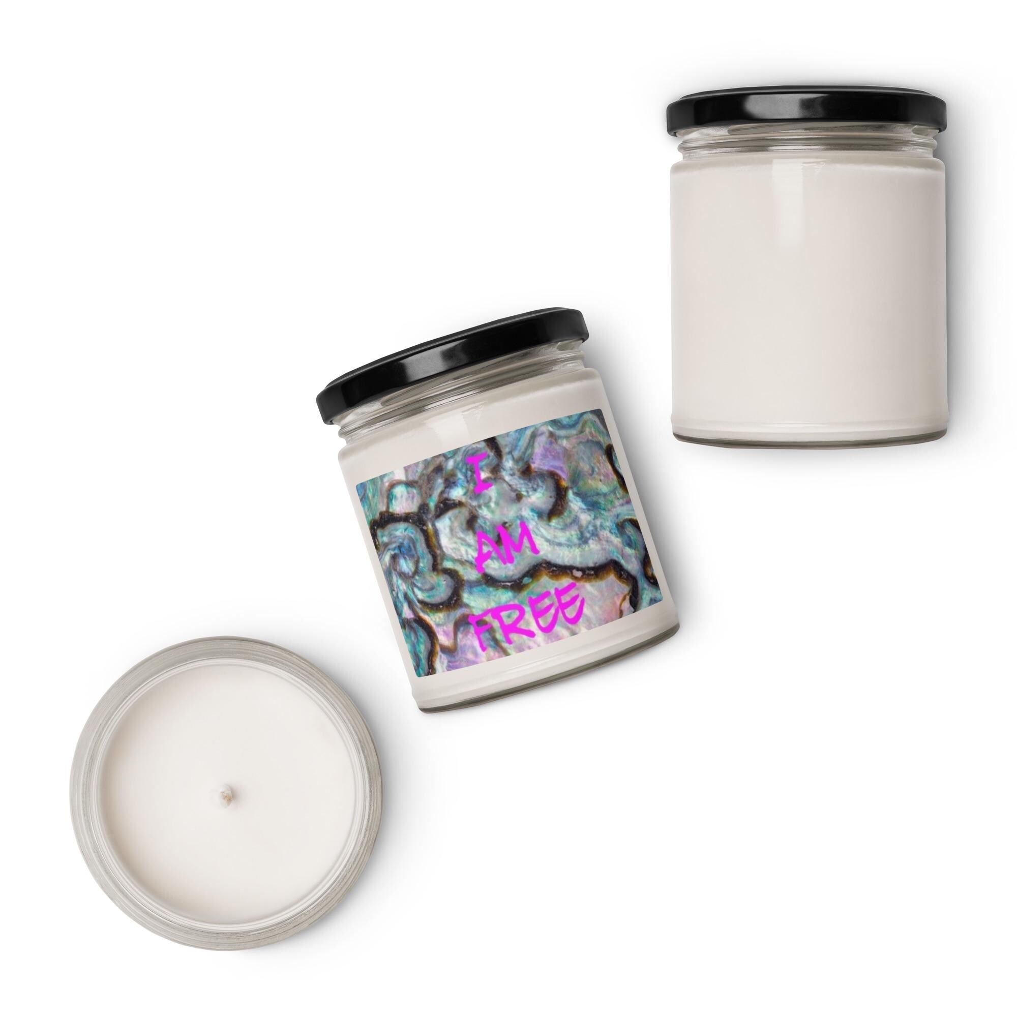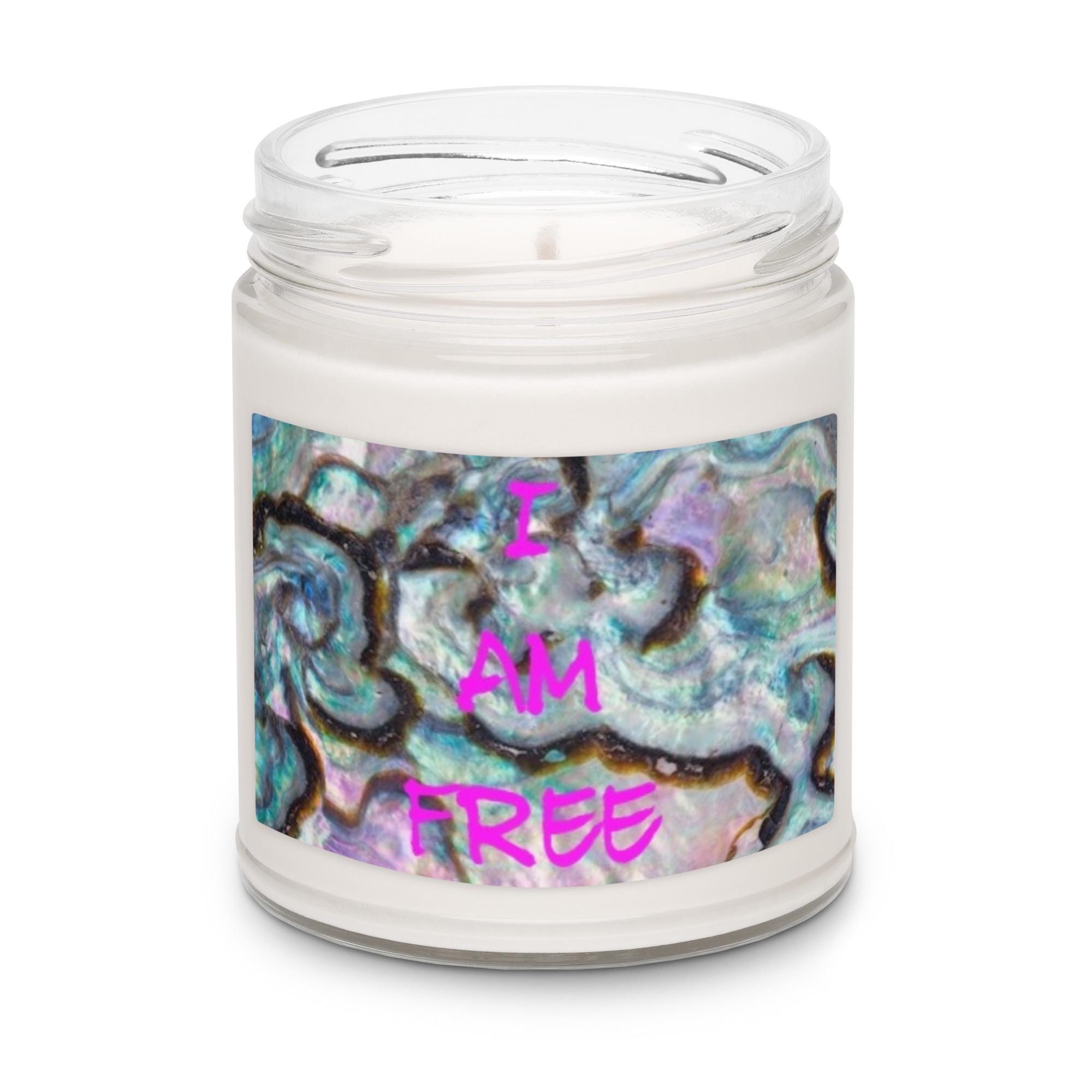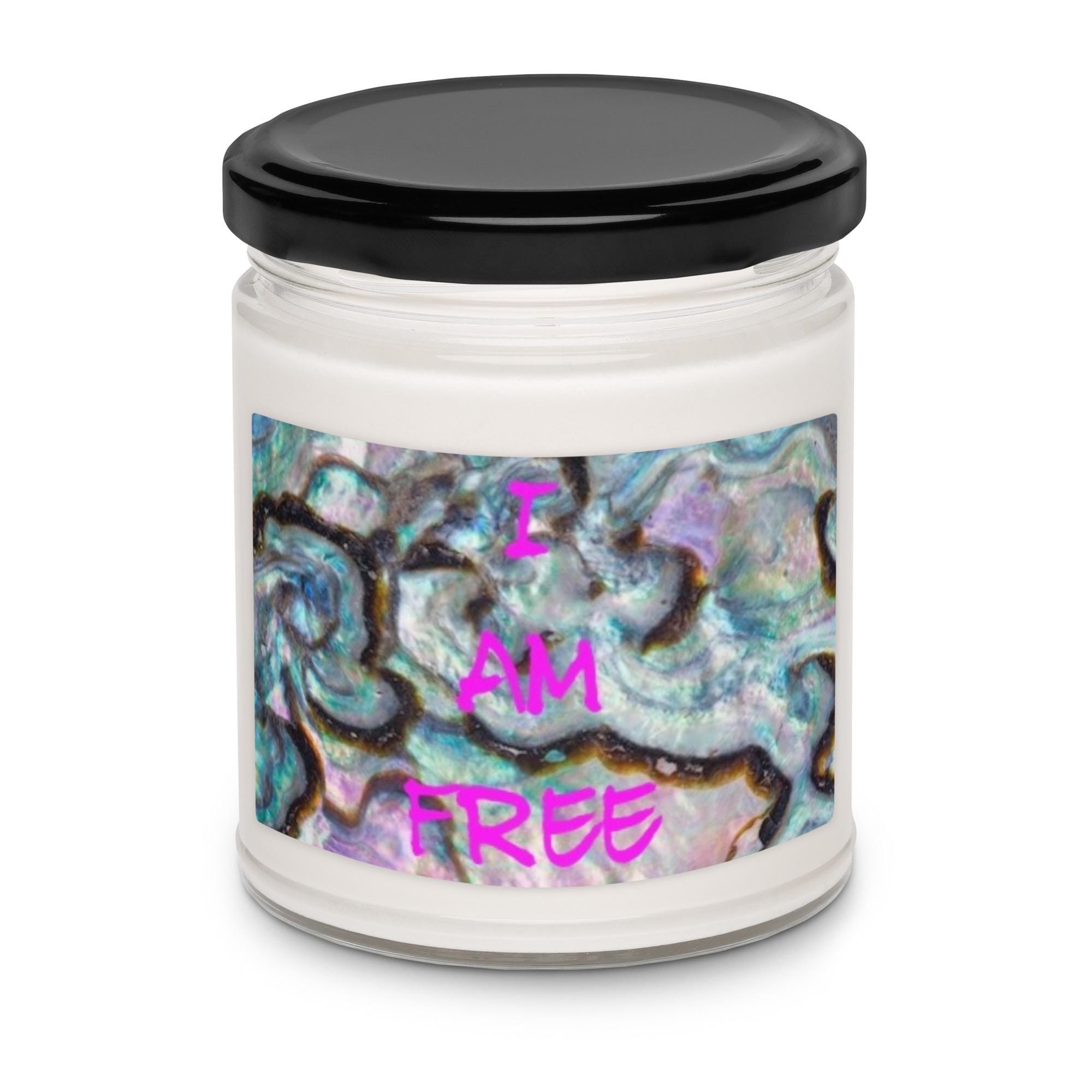 Infuse any sacred space with magic, mindfulness, and intention through this beautifully designed soy wax candle featuring the text "I AM FREE" on an abalone/paua background design. This candle is offered in 5 amazing scents and is a harmonious blend of art and aroma, created to support meditation, manifestation, and self-healing rituals.