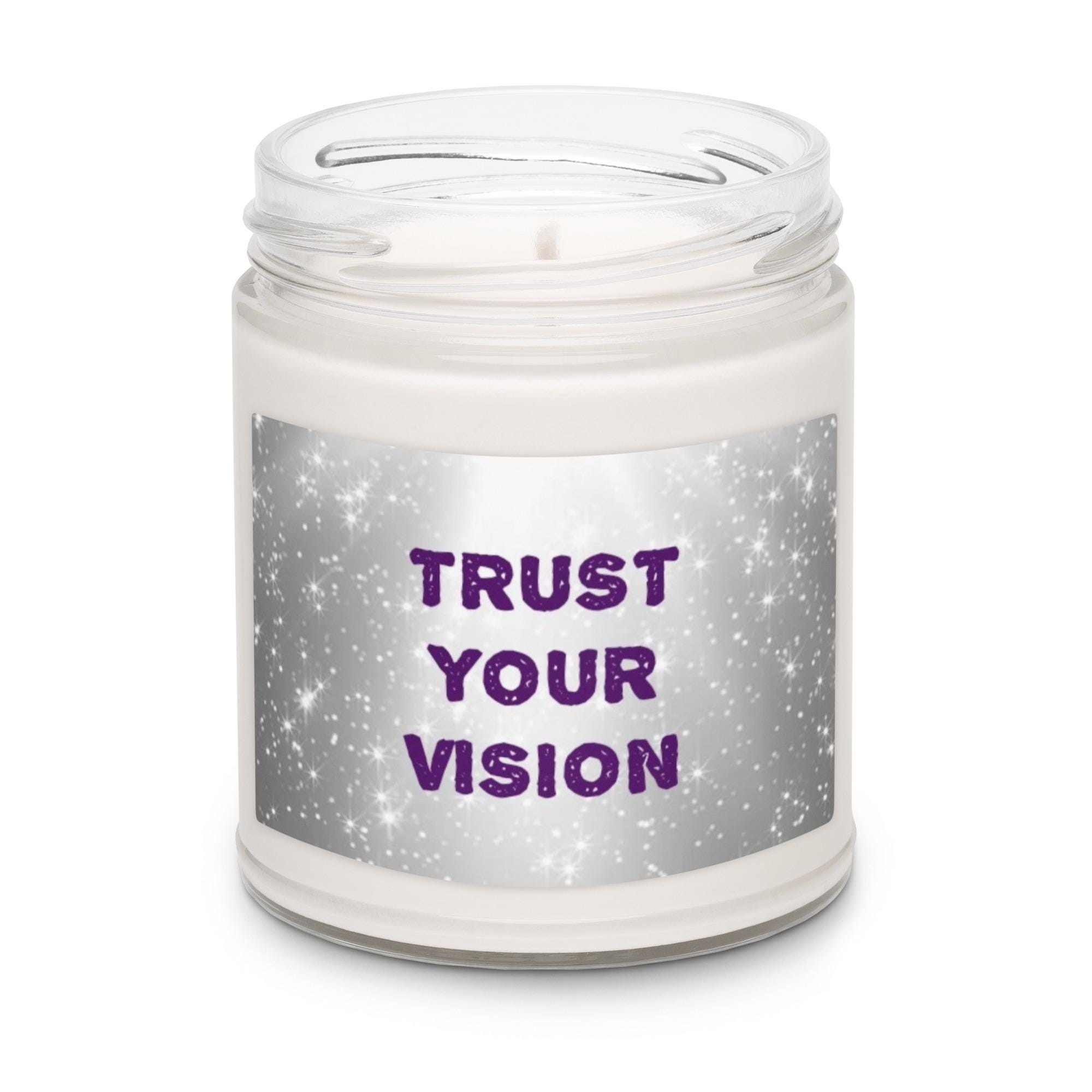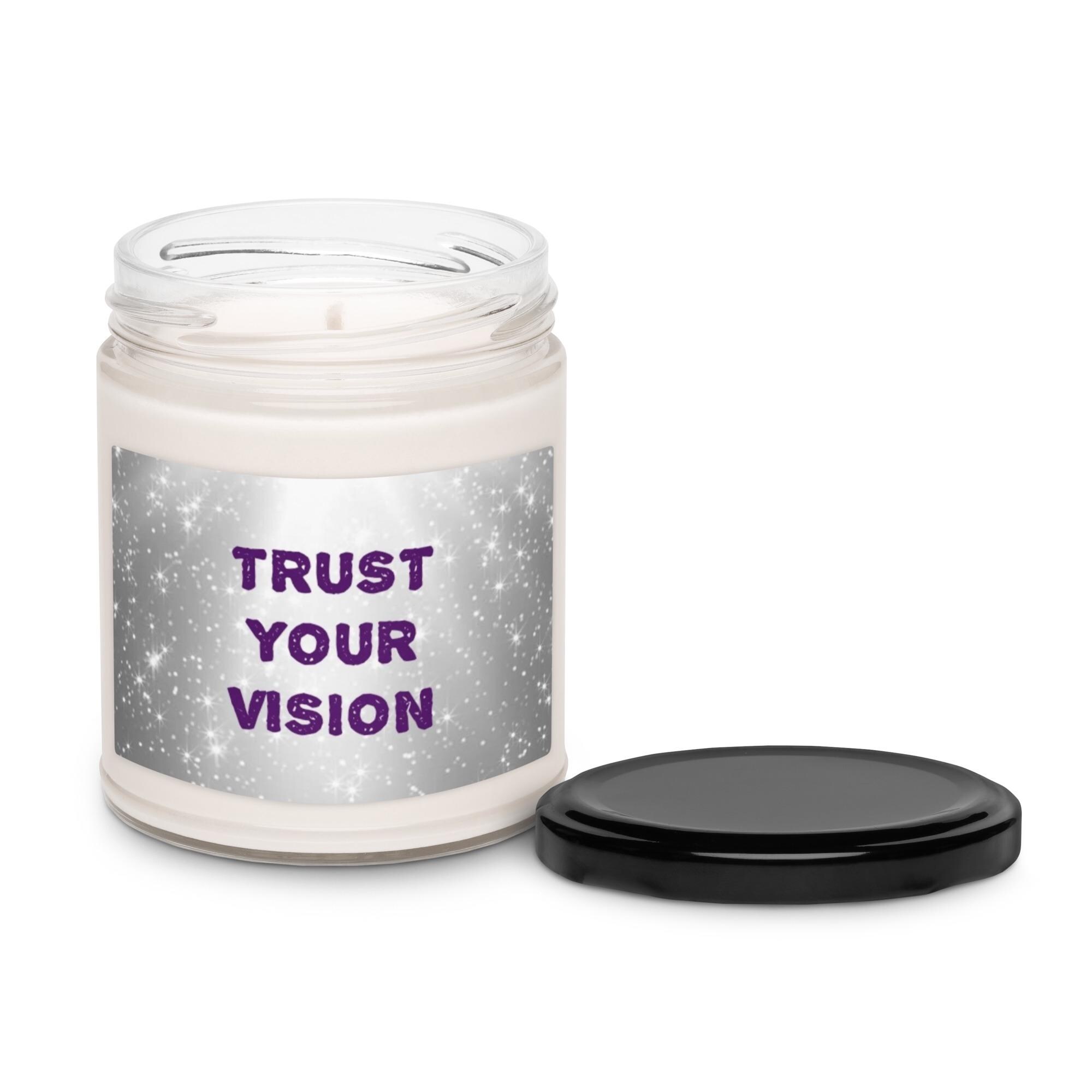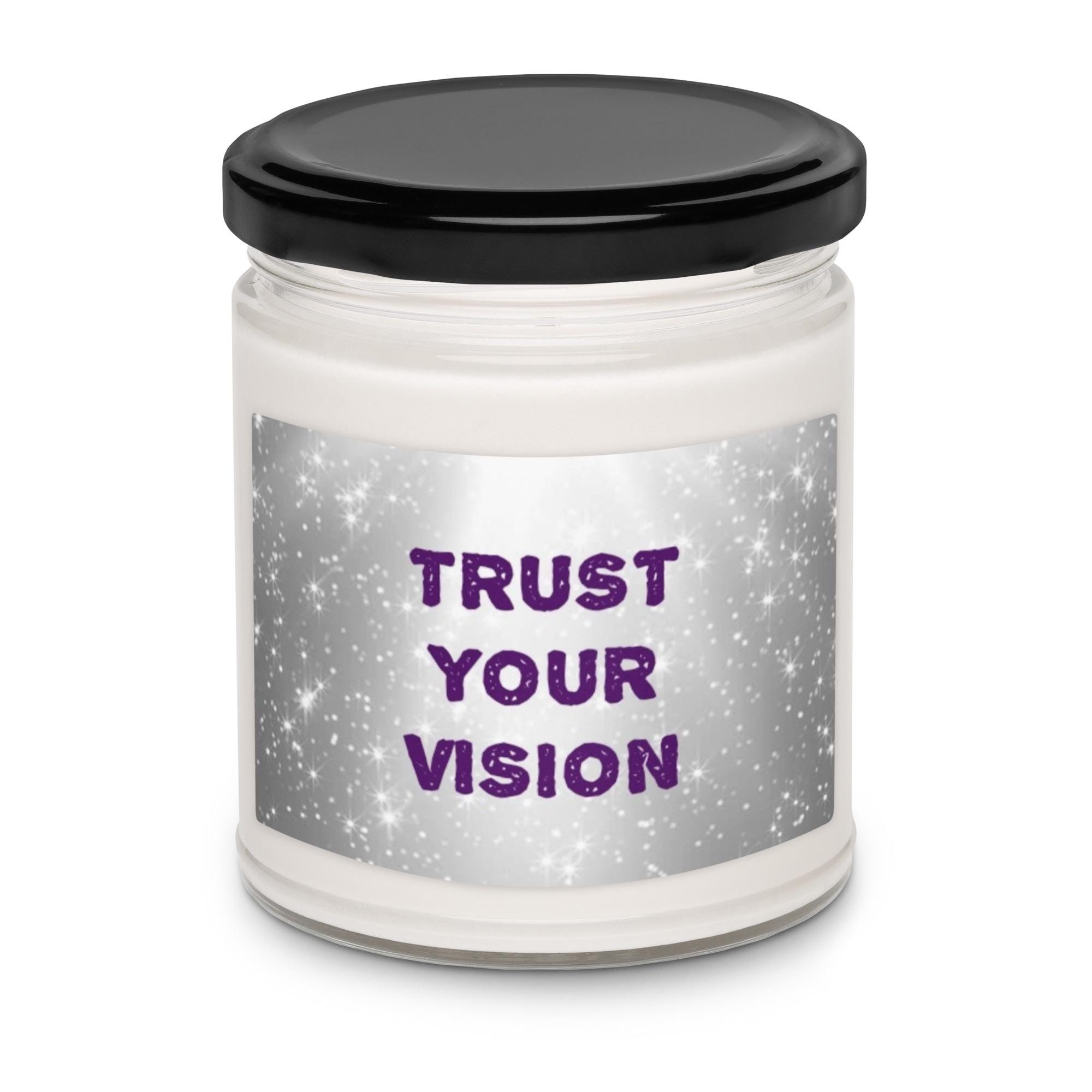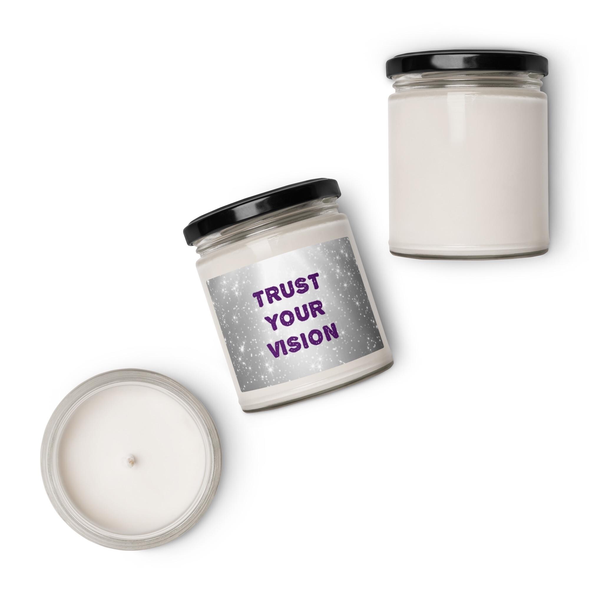 Infuse any sacred space with magic, mindfulness, and intention through this beautifully designed soy wax candle featuring the text "TRUST YOUR VISION" on a silver and white star background design. This candle is offered in 5 amazing scents and is a harmonious blend of art and aroma, created to support meditation, manifestation, and self-healing rituals.