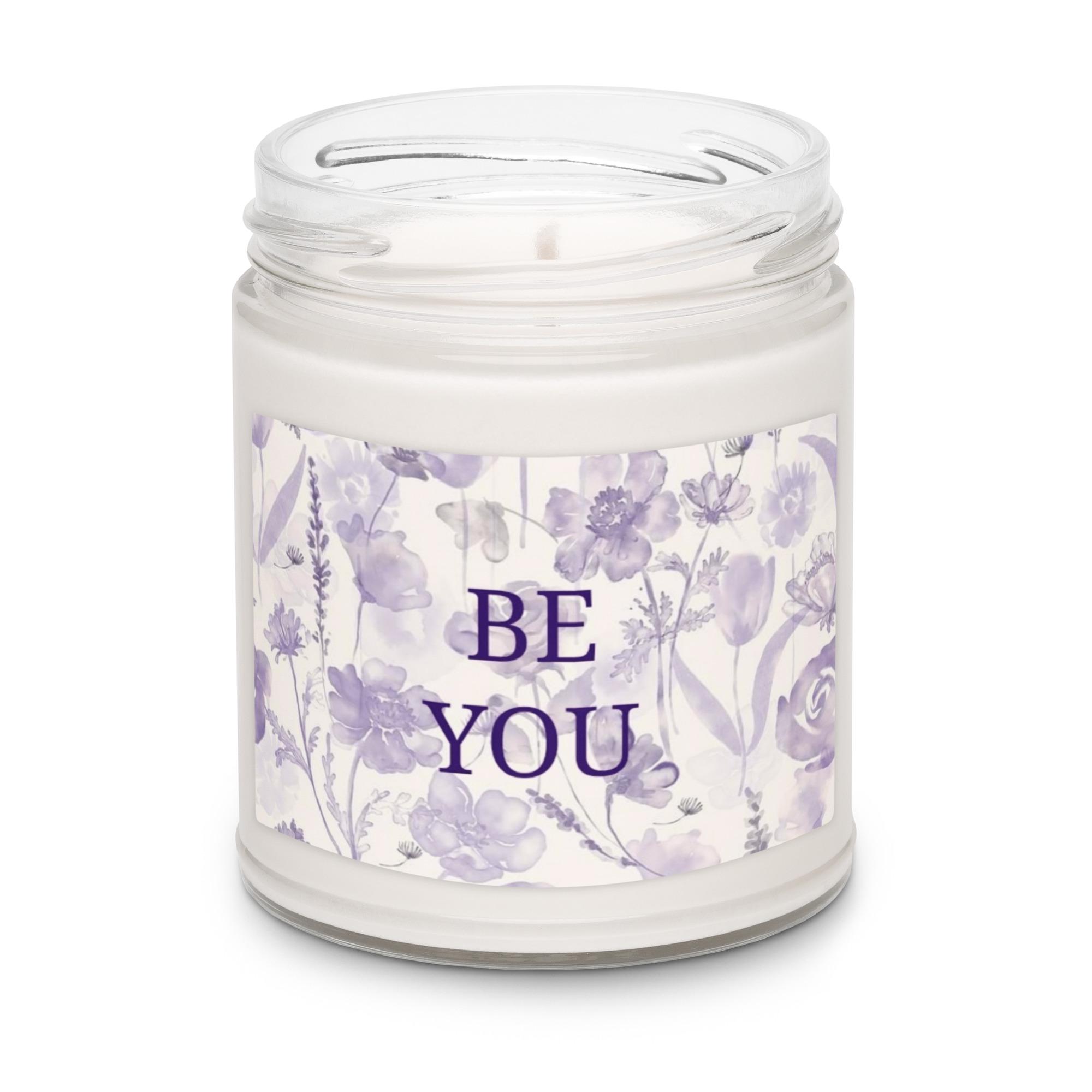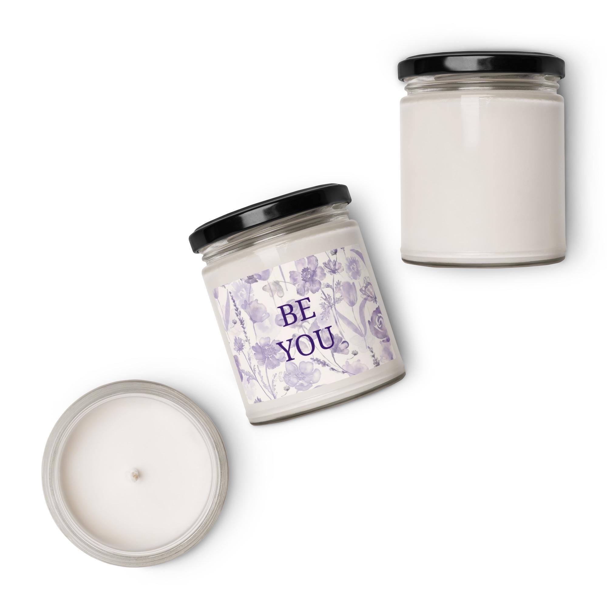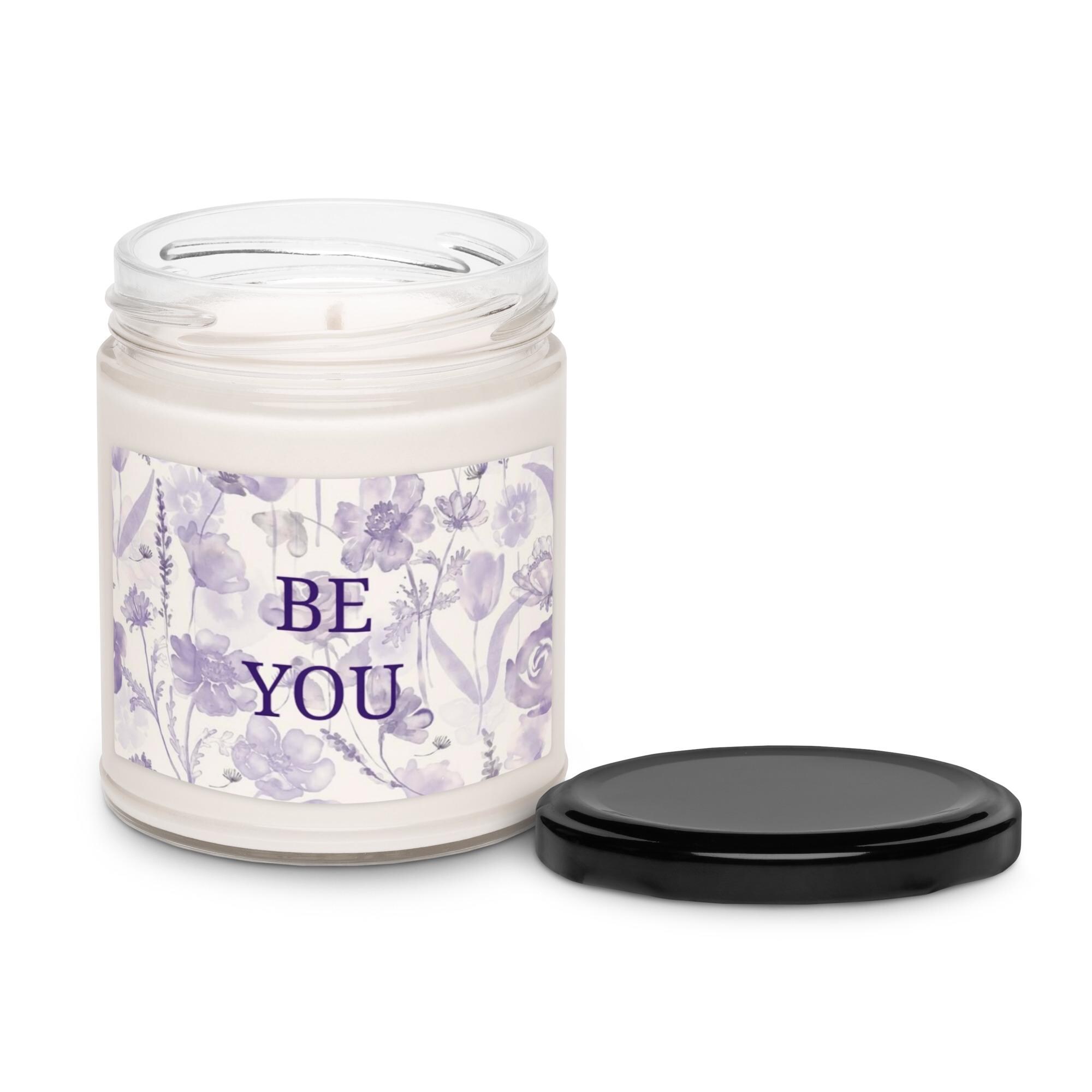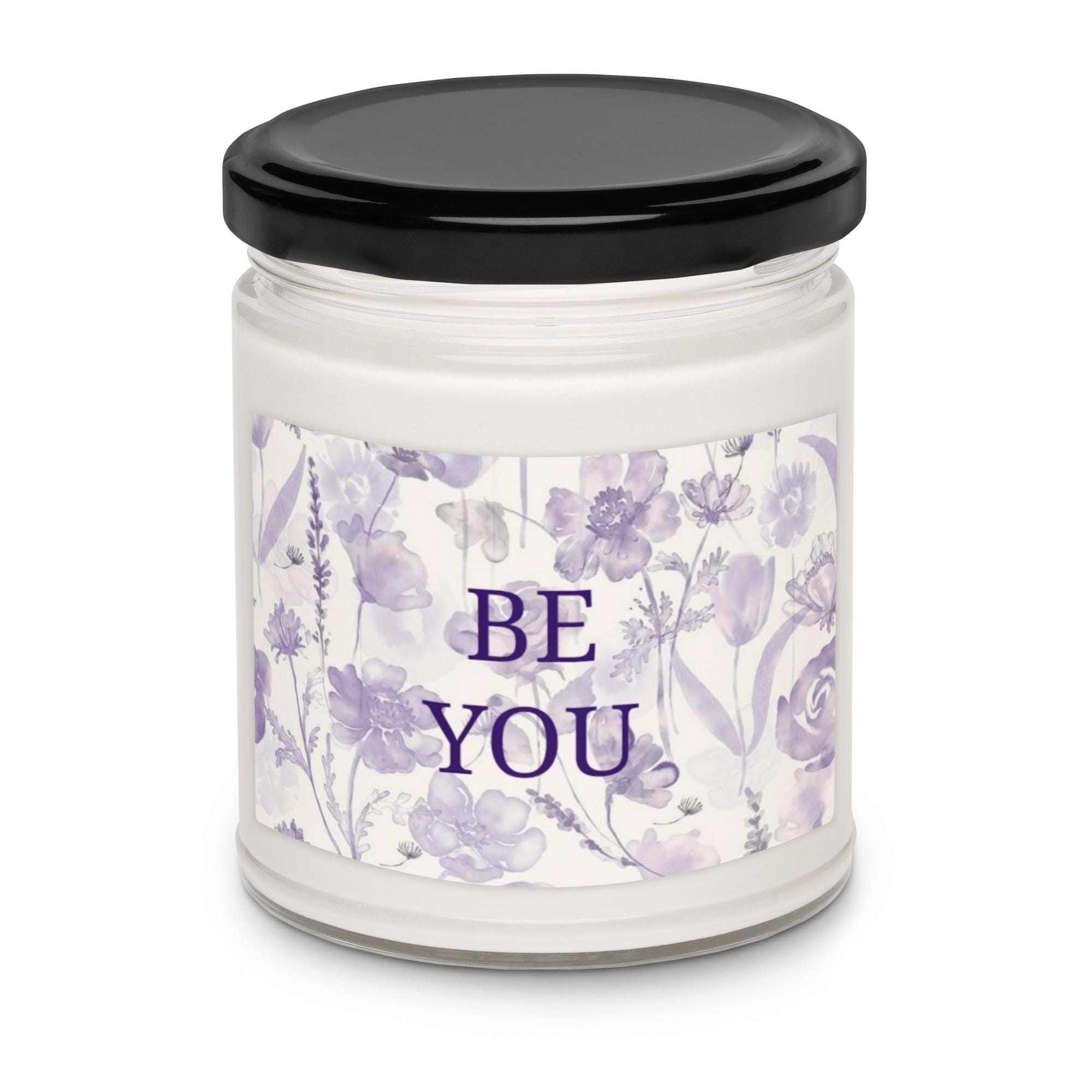 Infuse any sacred space with magic, mindfulness, and intention through this beautifully designed soy wax candle featuring the text "BE YOU" on a light purple and white floral background design. This candle is offered in 5 amazing scents and is a harmonious blend of art and aroma, created to support meditation, manifestation, and self-healing rituals.