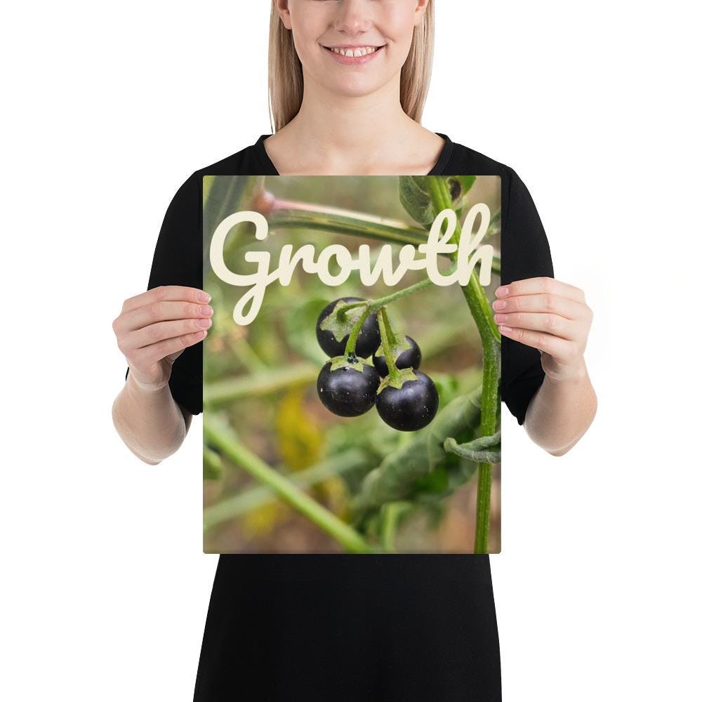 Looking to add a little flair to your decor? Look no further. This canvas print has a vivid, fade-resistant print of an original Karma Craftess photo of berries in her whimsical witchy backyard with the word "Growth" printed in artistic font.