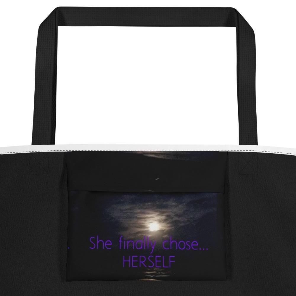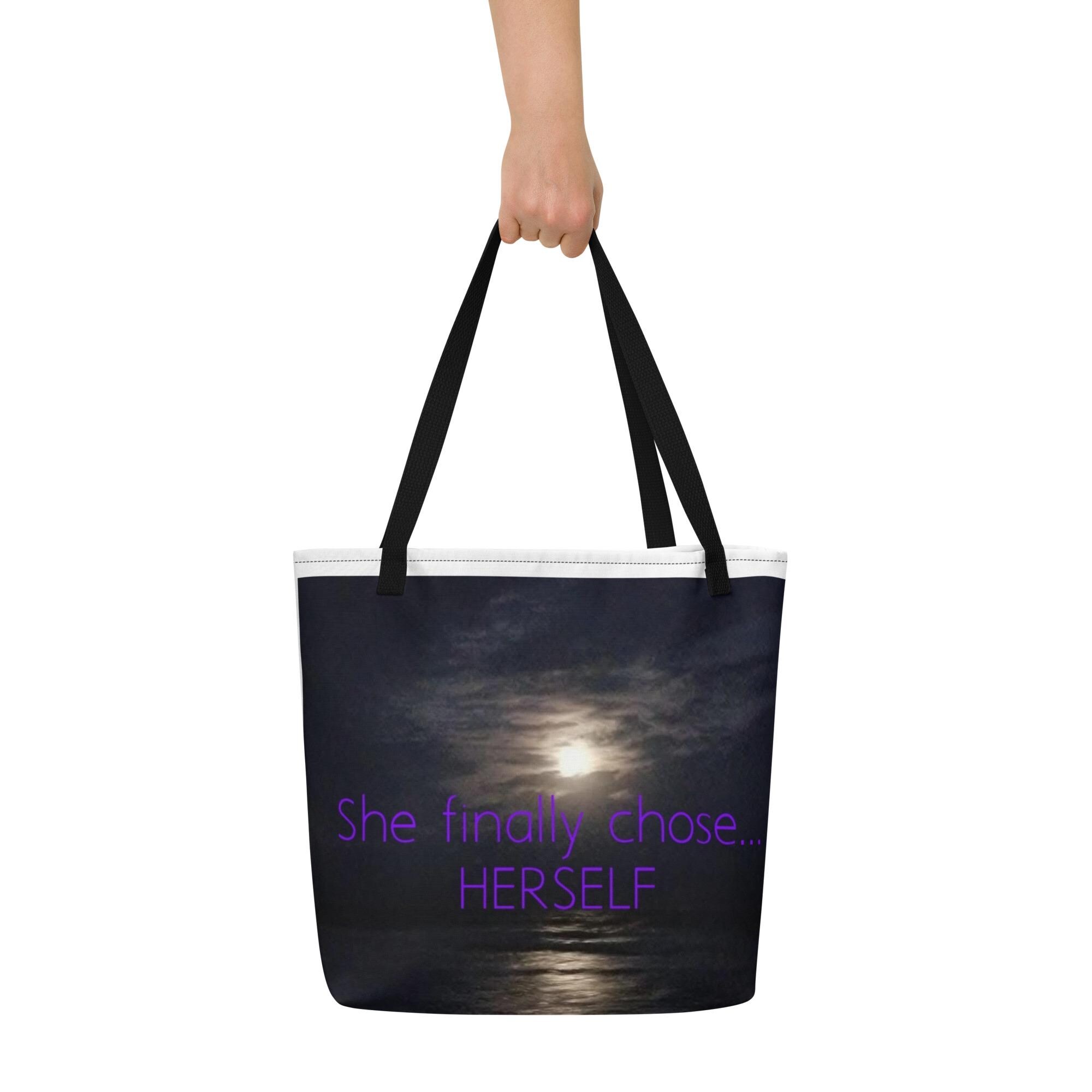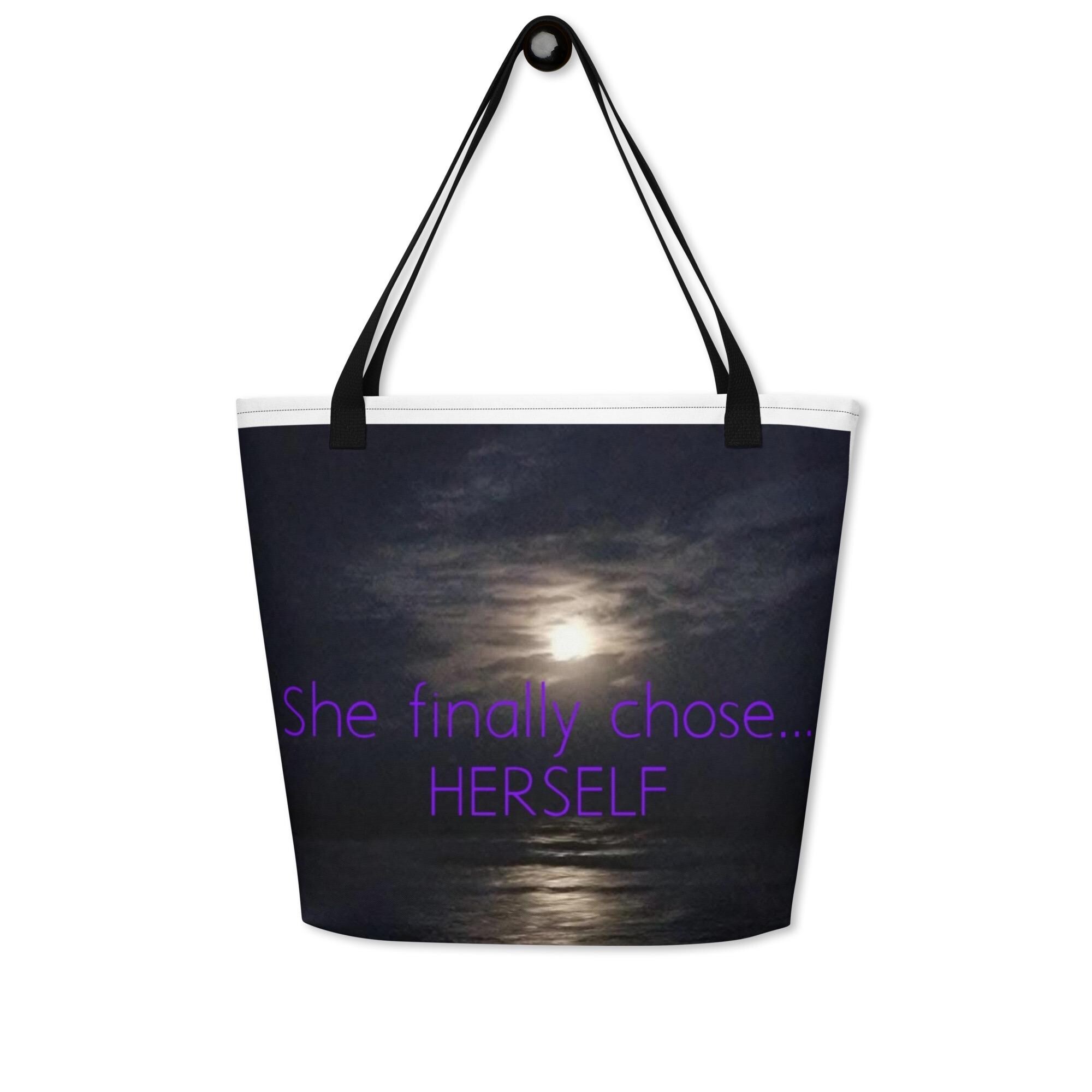A trendy tote with all over print and inside pocket. Print is an original Karma Craftess photo of the beach at night in Folly Beach, South Carolina and the quote "She Finally Chose Herself".