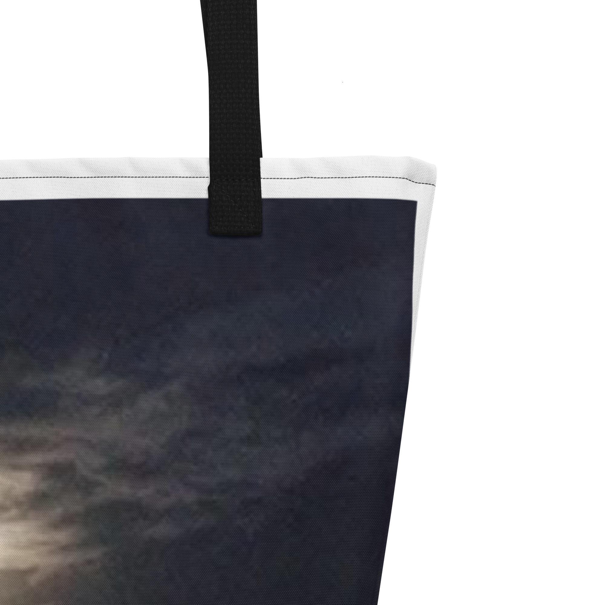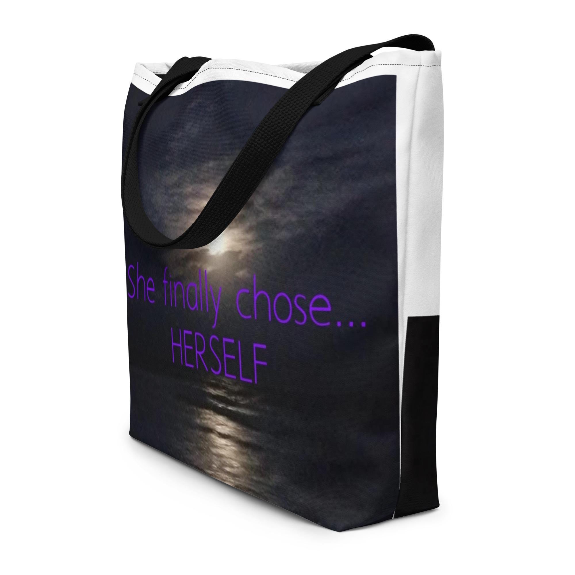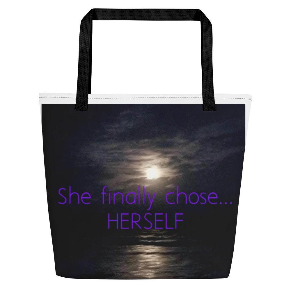 A trendy tote with all over print and inside pocket. Print is an original Karma Craftess photo of the beach at night in Folly Beach, South Carolina and the quote "She Finally Chose Herself".